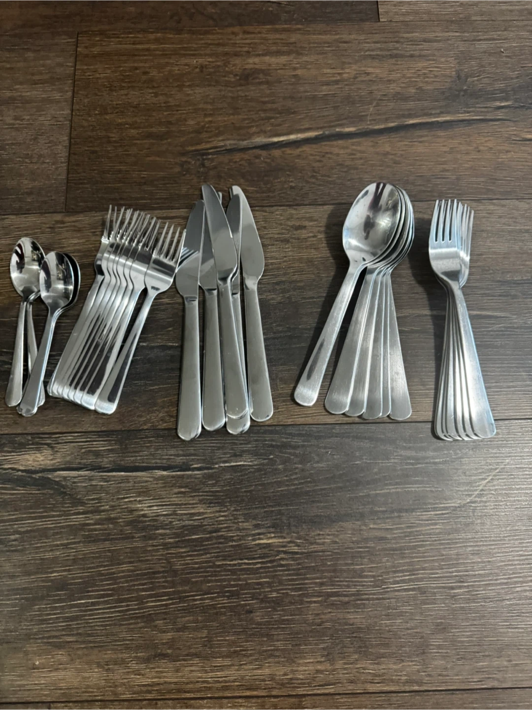 Selling a cutlery set that includes forks, spoons, and knives. Perfect for everyday use or for setting up a new kitchen! All pieces are in great condition and ready to use. 08 of each