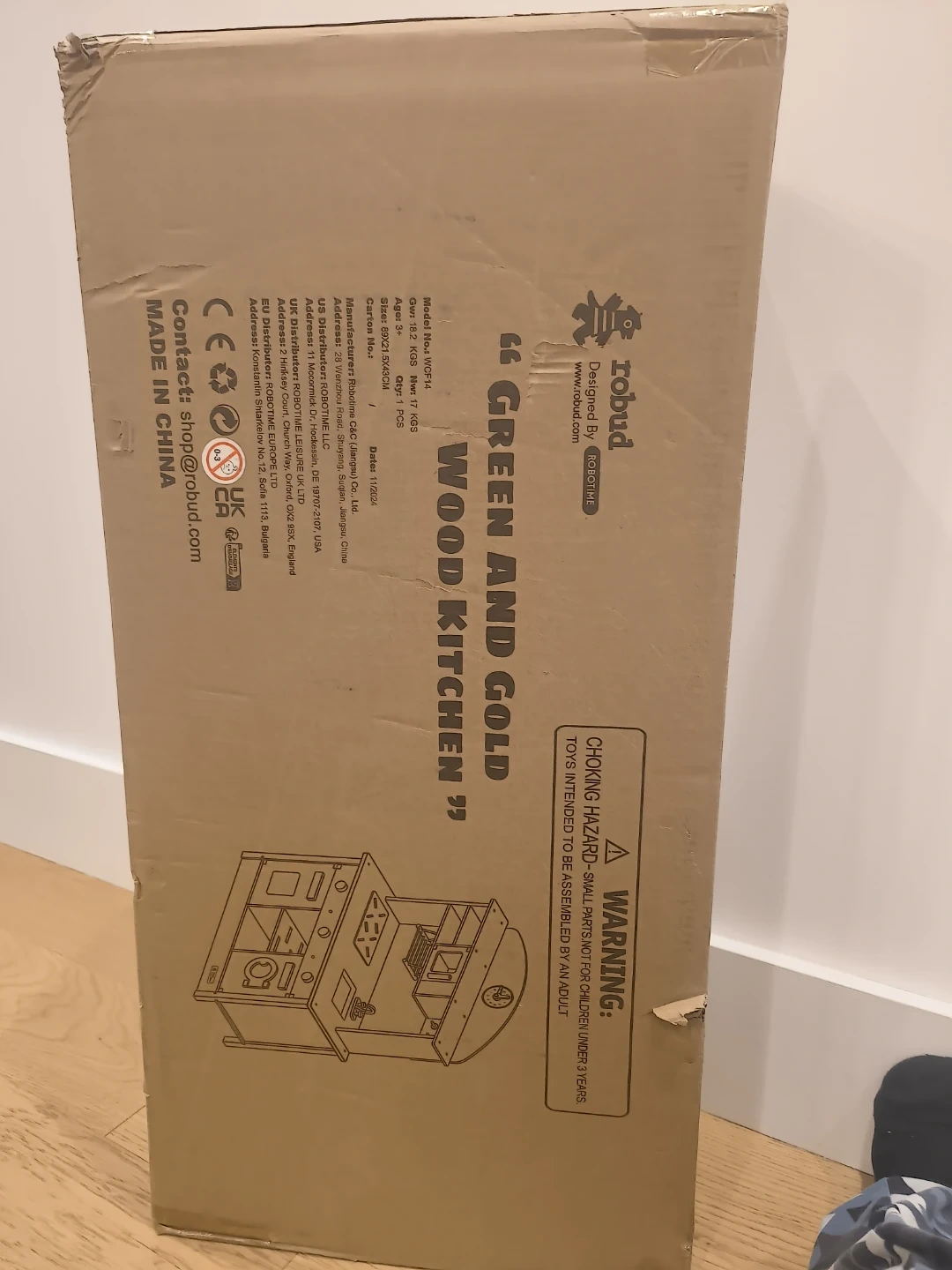 This ROBUD wooden play kitchen set is perfect for kids aged 3 and up! It features a green and gold design and comes in its original box. Great for imaginative play and developing fine motor skills, this toy kitchen will provide hours of fun for your little ones