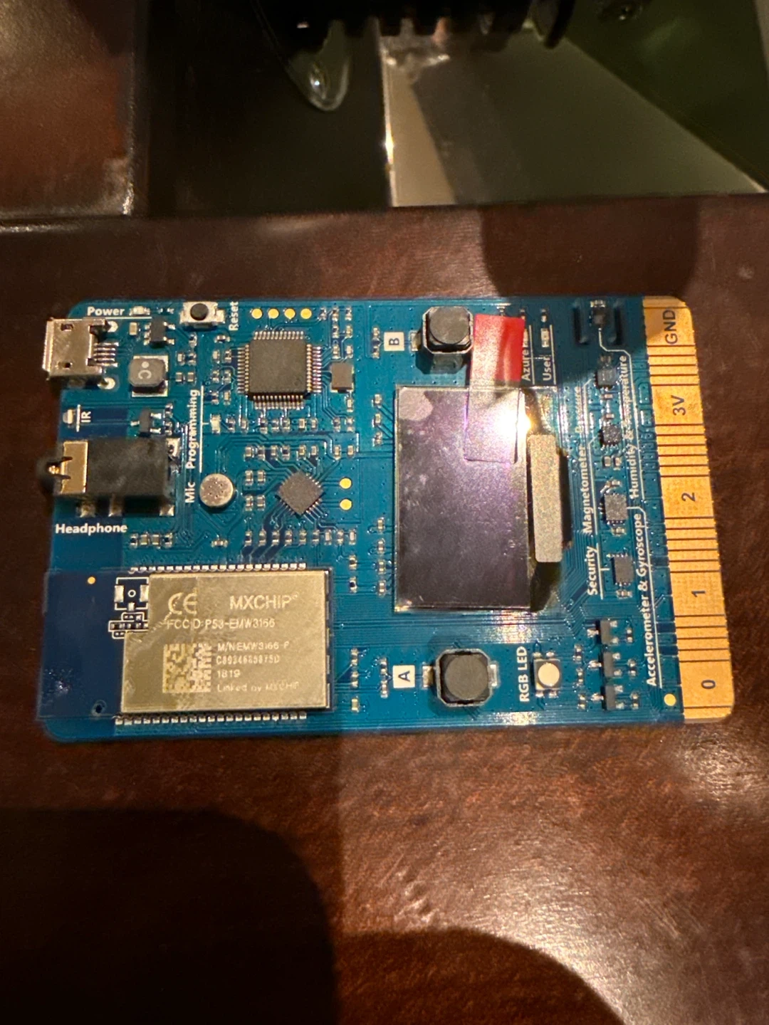 Selling a MXCHIP IoT EMW3156 development board. It has connections for headphones, power, IR and Mic programming. Also features a reset button, RGB LED, and sensors for security, magnetometer, accelerometer & gyroscope, and humidity & temperature