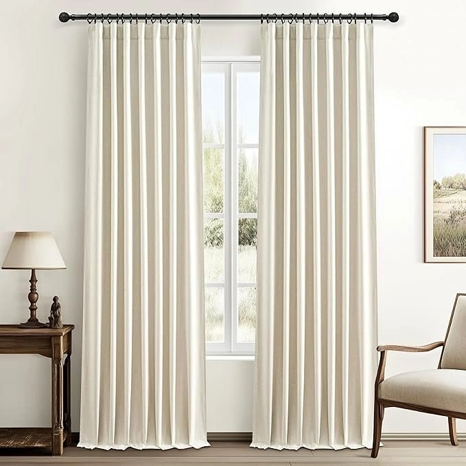 New in Package. Quality Fabric: These modern linen draperies are crafted from blended fabric (30% linen, 70% polyester), drape well and are not easy to wrinkle. Suitable for various styles: modern, farmhouse, boho, neutral, bedroom, living room, nursery, dining room, sliding door, etc. 100% Blackout Curtains: White backing definitely can block out full sunlight, UV rays and work well in thermal insulating, noise reducing, balance temperature, providing complete darkness and privacy in a room. Ready Made: Set of 2 Curtain Panels per package with 32 curtain rings and 32 pin hooks. Item is located in Port Robinson.