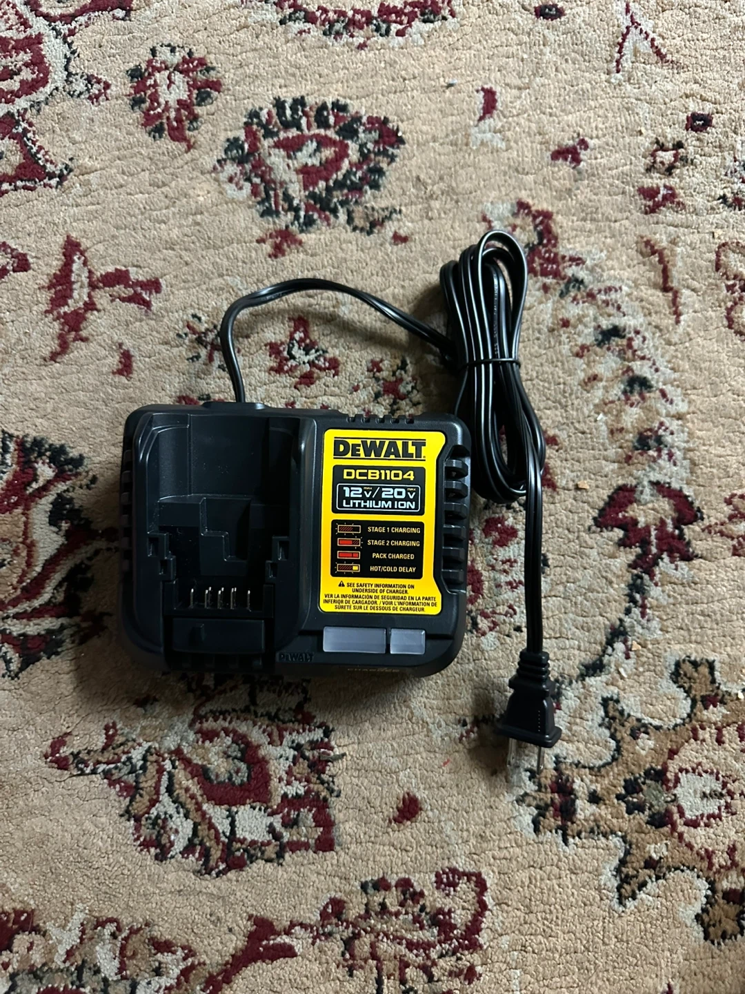 Selling a DeWalt DCB1104 battery charger for 12V and 20V lithium-ion batteries. It indicates charging stages and has a hot/cold delay feature for safety