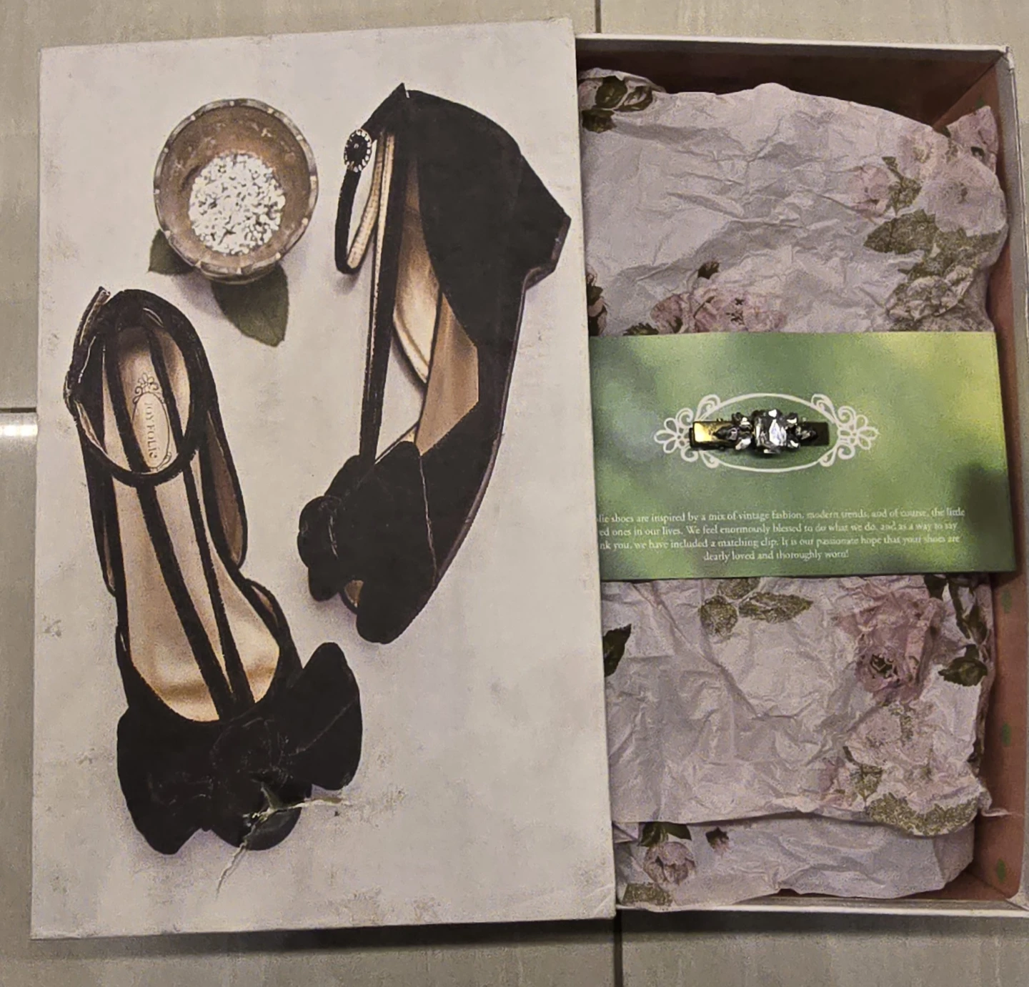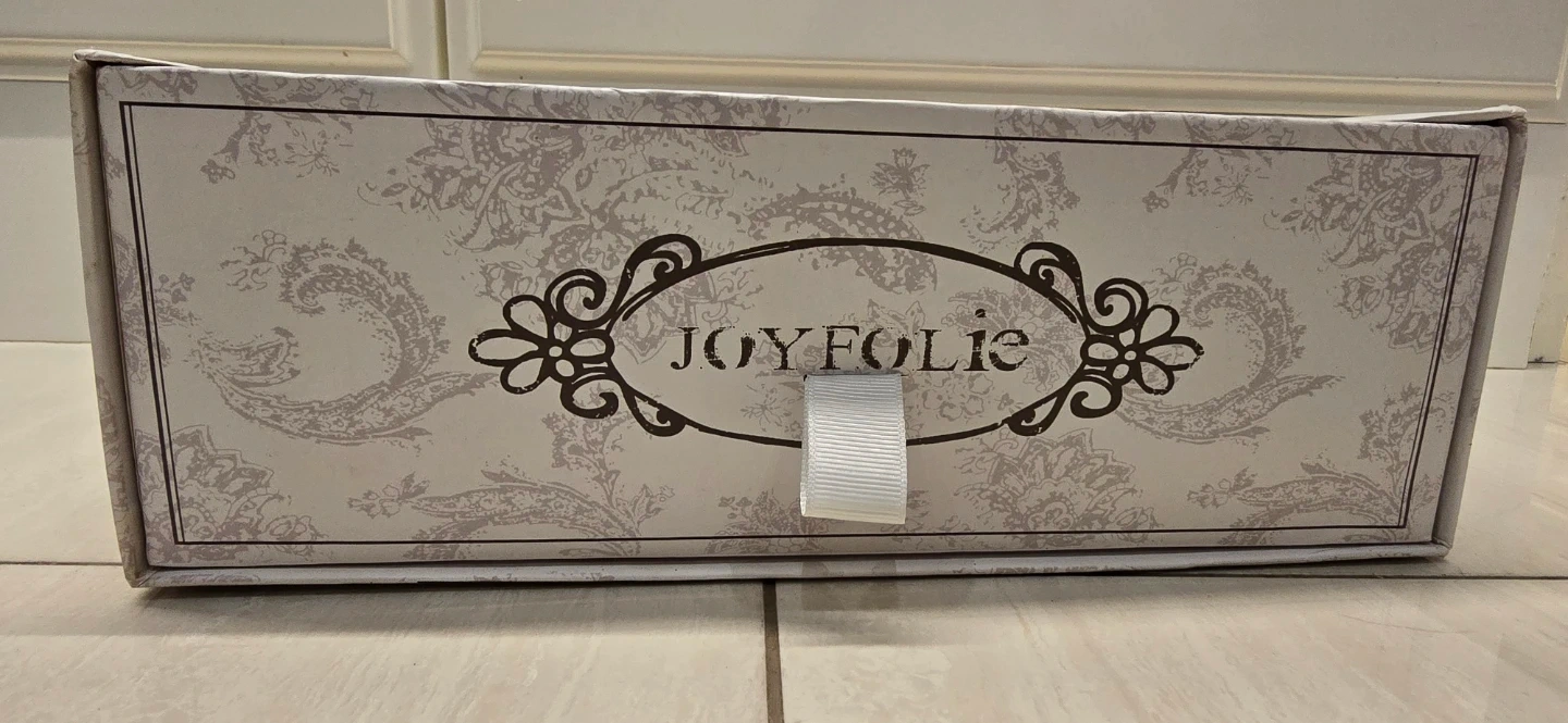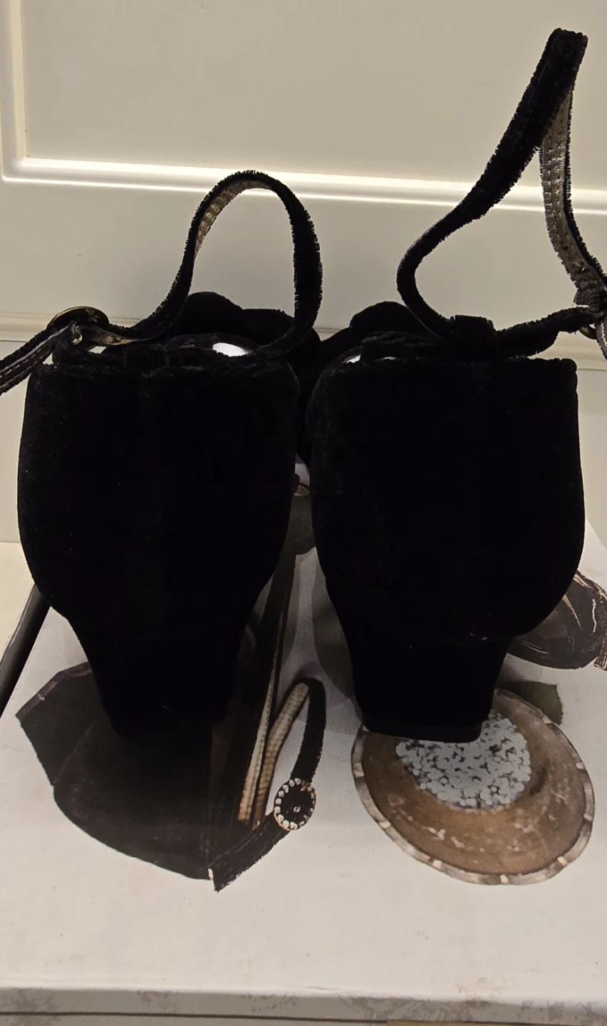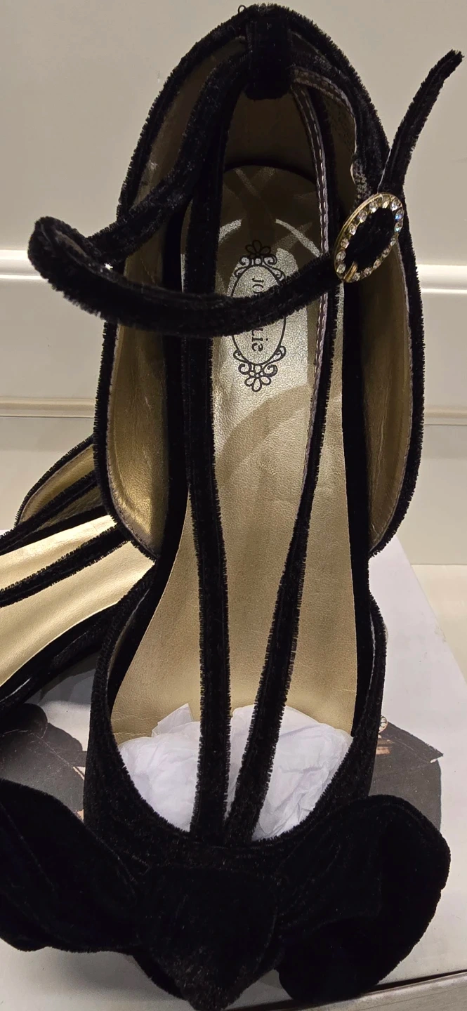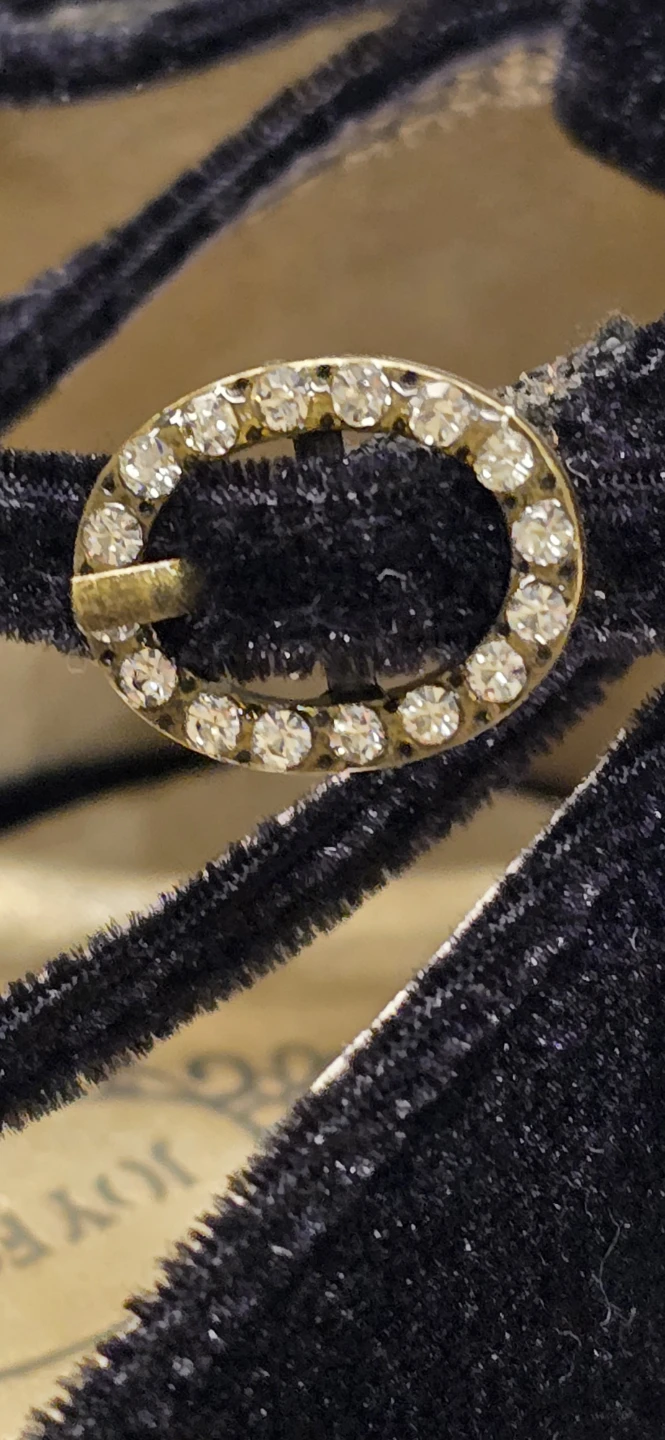 These gorgeous black velvet shoes are brand new, never worn! It features a cute bow detail and a unique strap design with shiny stone details on the buckle. It also comes with a collectable hair pin from this designer, Joy Folie in a fancy pull-out box! Perfect the Christmas holidays or for a special occasion! May also fit a womens size 5.5 or 6.