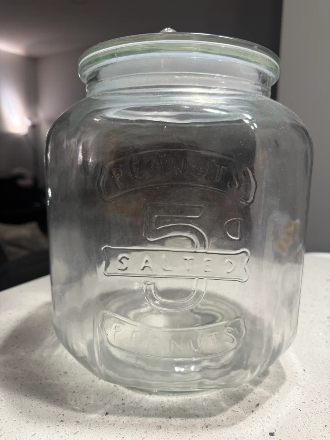 Selling a huge vintage-style glass jar with a peanut-shaped handle on the airtight lid. The jar has "Peanuts 5¢ Salted Peanuts" embossed on the front. It's a unique piece for storing snacks or as a decorative item!