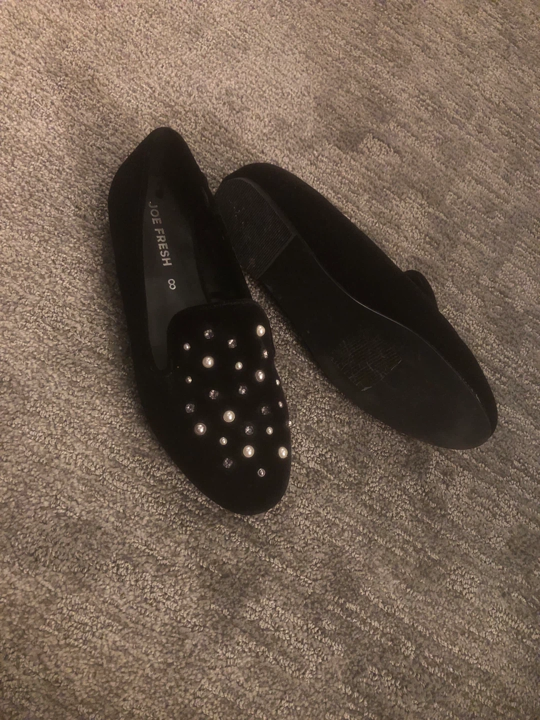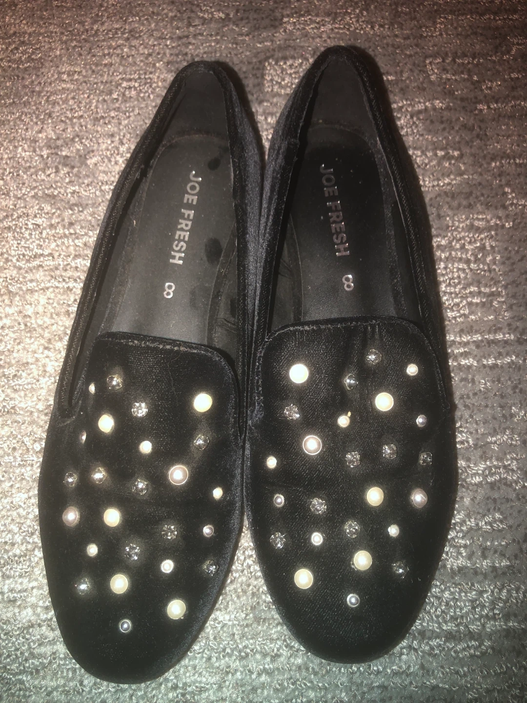 133Selling a pair of Joe Fresh loafers in size 8. They're black velvet and have some really cute pearl and rhinestone detailing on the top. They're in great condition!