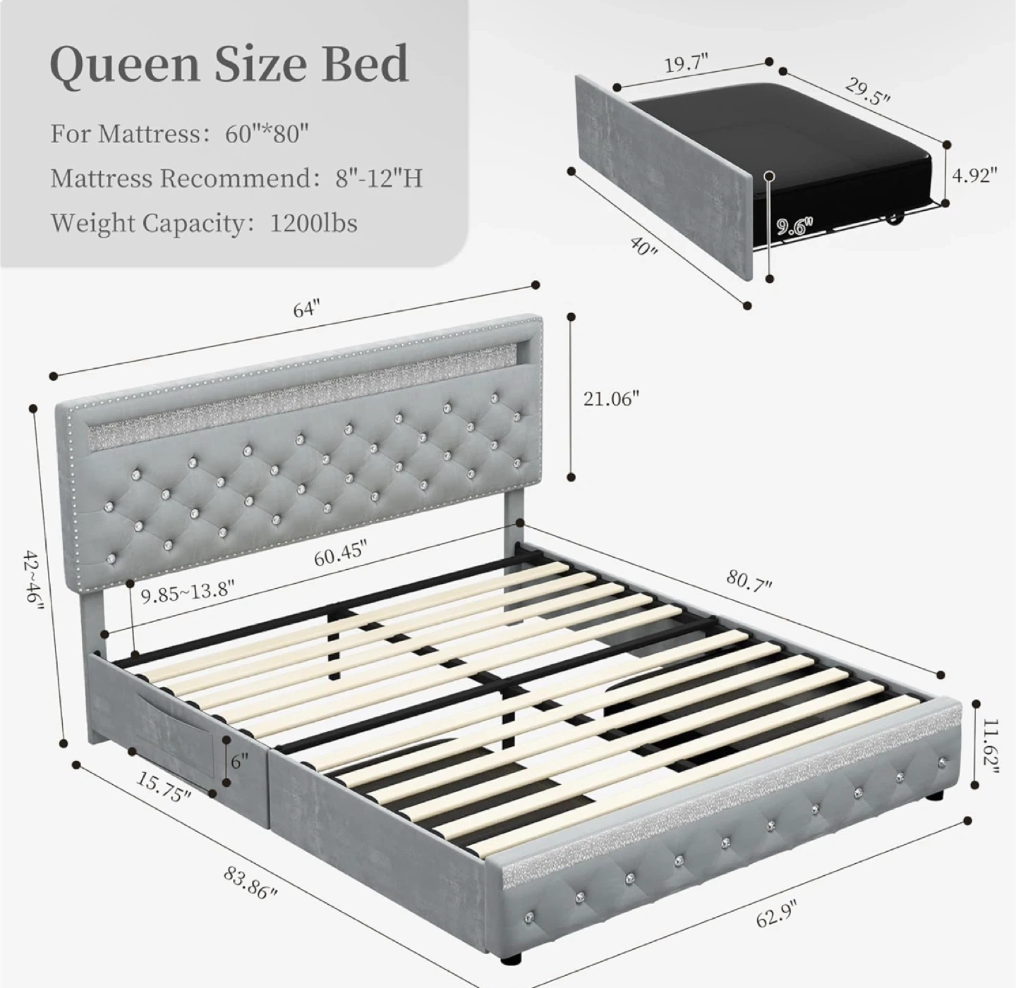 Je vends un lit Queen Size de couleur grise avec des lumières LED intégrées! Le lit est conçu pour un matelas de 60" x 80". Il est recommandé d'utiliser un matelas de 8" à 12" de hauteur. La capacité de poids est de 1200 lbs.