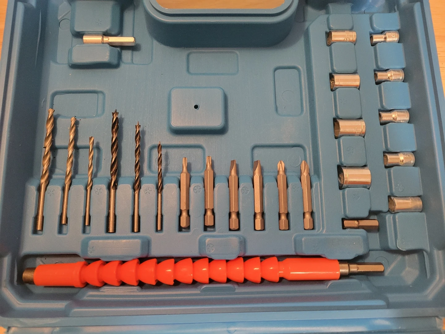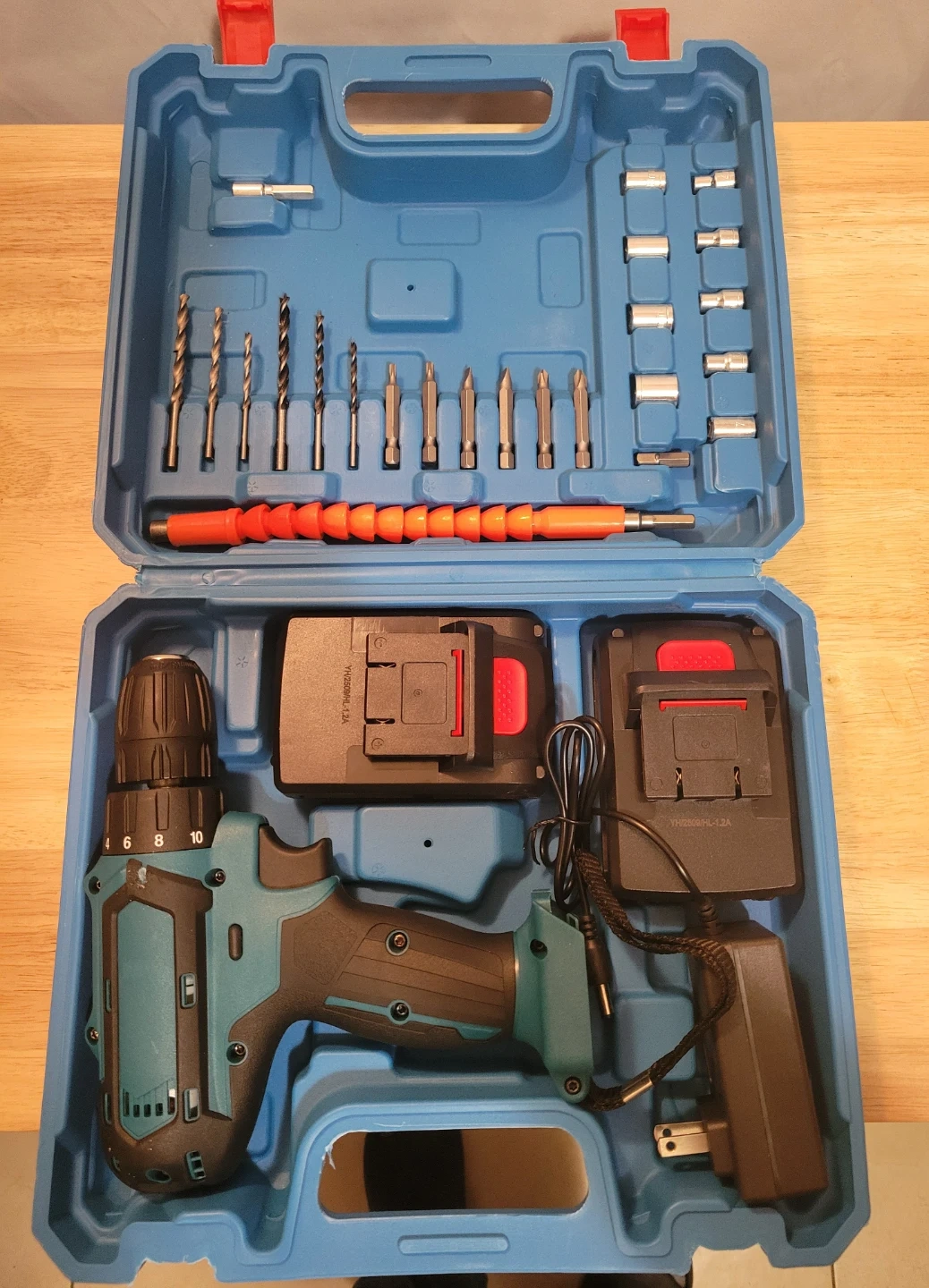 Selling a cordless drill driver kit. It comes with a variety of drill bits and driver heads, along with two batteries and a charger. The drill and all accessories are neatly organized in a sturdy carrying case.