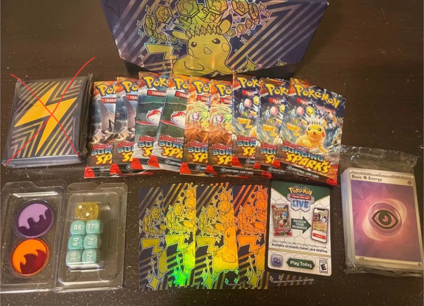 130All cards are new condition with no white spots on card. Over 150 cards Including 9 opened packs, 45 sealed energies, guide book, 6 dice, 1 coin flip die, 2 markers, collection box, 4 dividers. Rare, EX, holo, uncommon, common, energies, and code cards. Can do trades for some Prismatic cards Meet in South Surrey/White Rock or Richmond