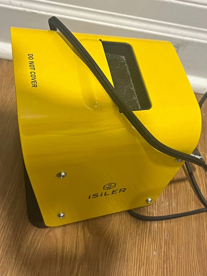 iSiLER NPE-2 portable ceramic fan heater in great working condition! Compact 1500W heater with PTC ceramic heating elements provides fast, efficient warmth for rooms up to 108 sq ft. Features adjustable thermostat 41F-95F, tip-over protection, and automatic overheat shutoff for safety. Distinctive yellow and gray design with carry handle makes it easy to move room-to-room. Lightweight at just 38oz but packs serious heating power. Perfect for home office, bedroom, garage, or any space needing supplemental heat. ETL certified. Previously used but fully functional. Much more affordable than buying new! Retails for 60.