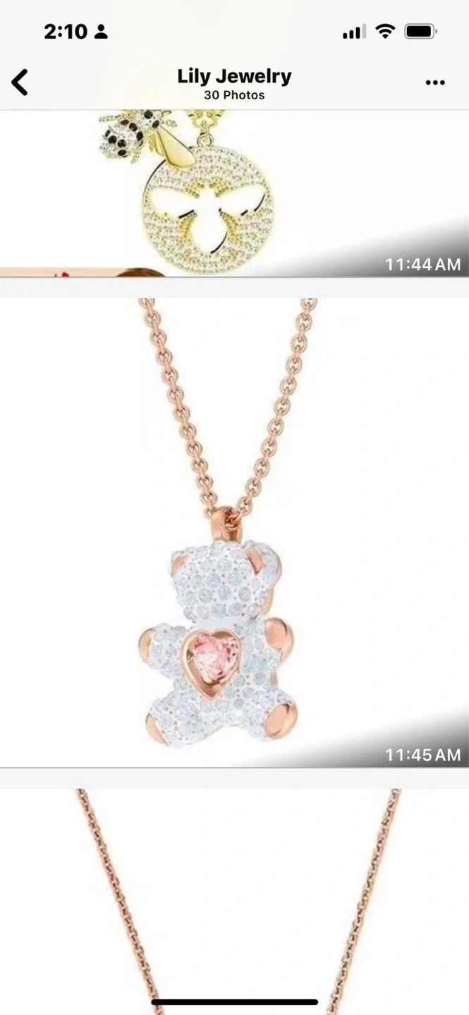 This is a Swarovski teddy bear pendant necklace. The teddy bear is white with a pink heart, and the chain is rose gold in colour. It's a brand new item.