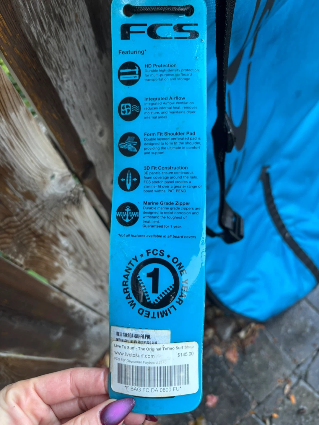 20Selling a used FCS surfboard boardbag, size 8'0. It's perfect for protecting your surfboard during transport or storage. It shows some signs of wear, but it's still functional and ready for your next surf trip!
