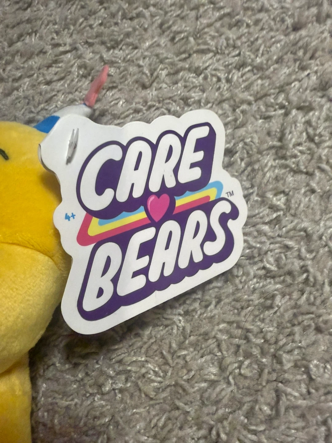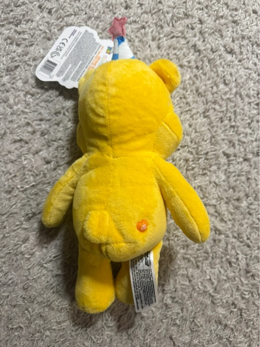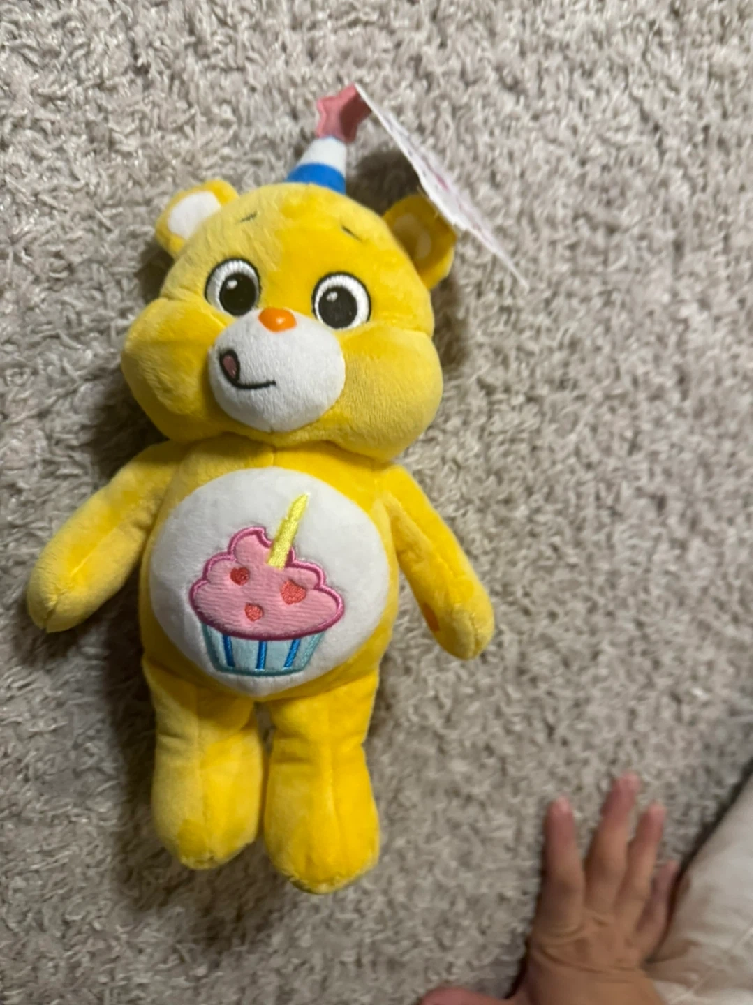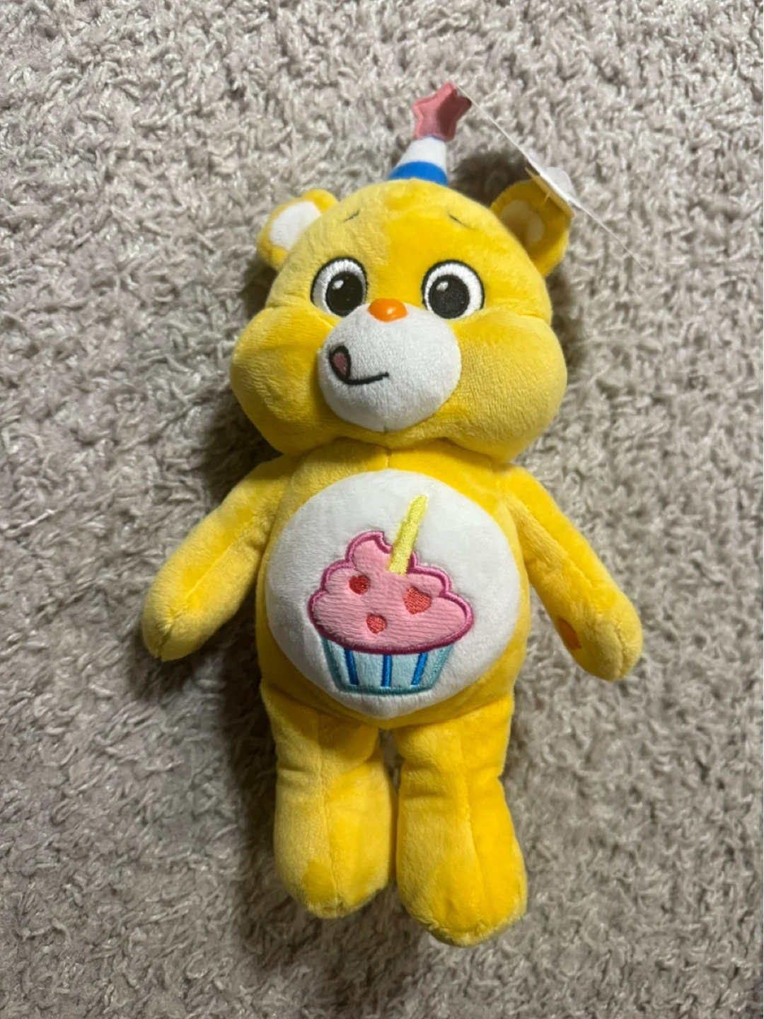 Selling a cute Care Bears Birthday Bear plush toy! It's in great condition and ready for a new home. This adorable yellow bear features a fun cupcake design on its belly and a party hat. Perfect for Care Bears collectors or as a gift for someone special