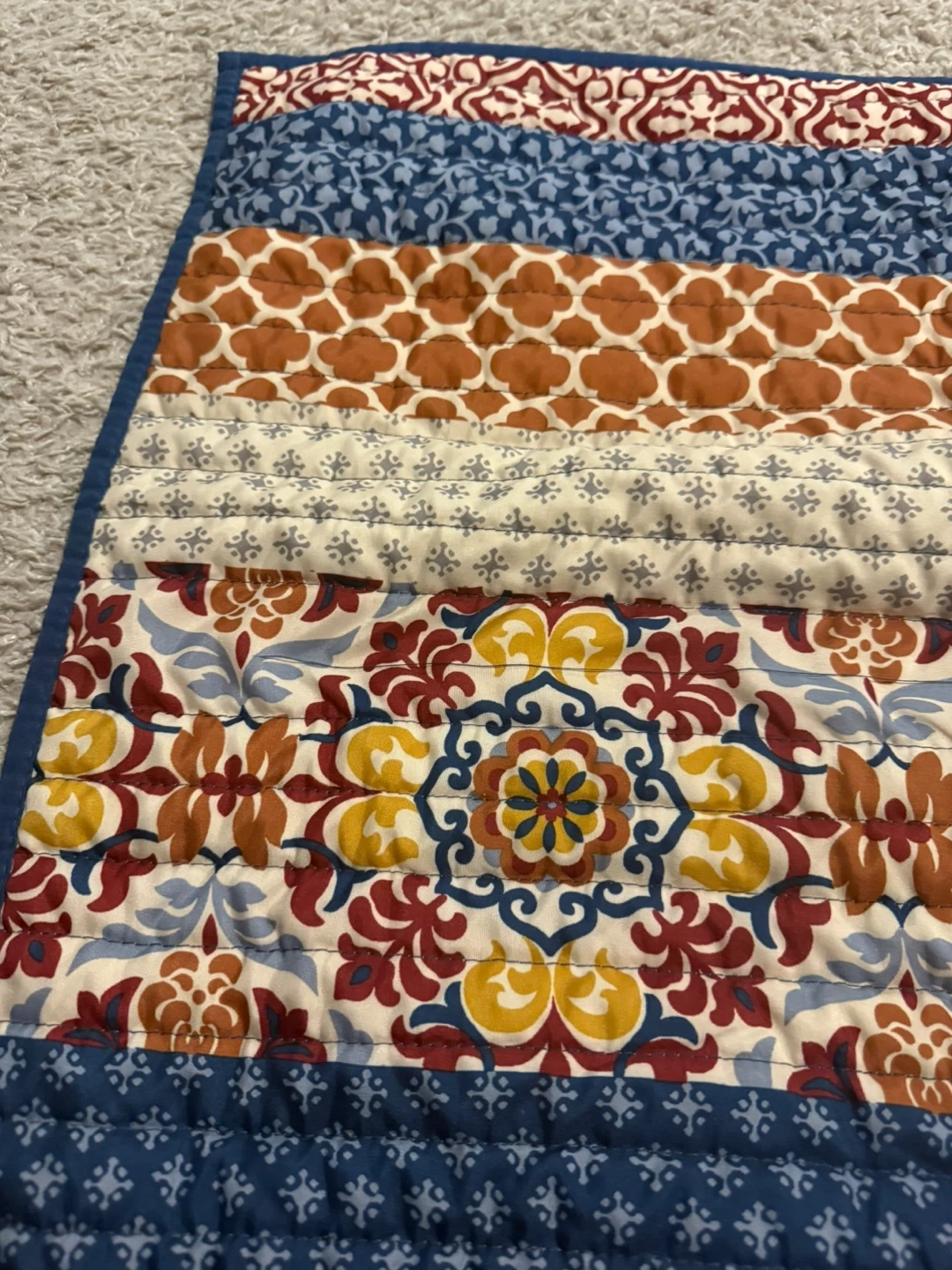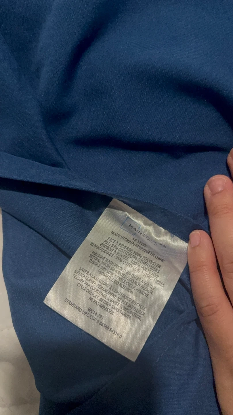 Here's a set of two Mainstays pillowcase. They feature a lovely pattern with blue, orange, and yellow accents. The material is a blend of 65% cotton and 35% polyester, making them easy to care for.