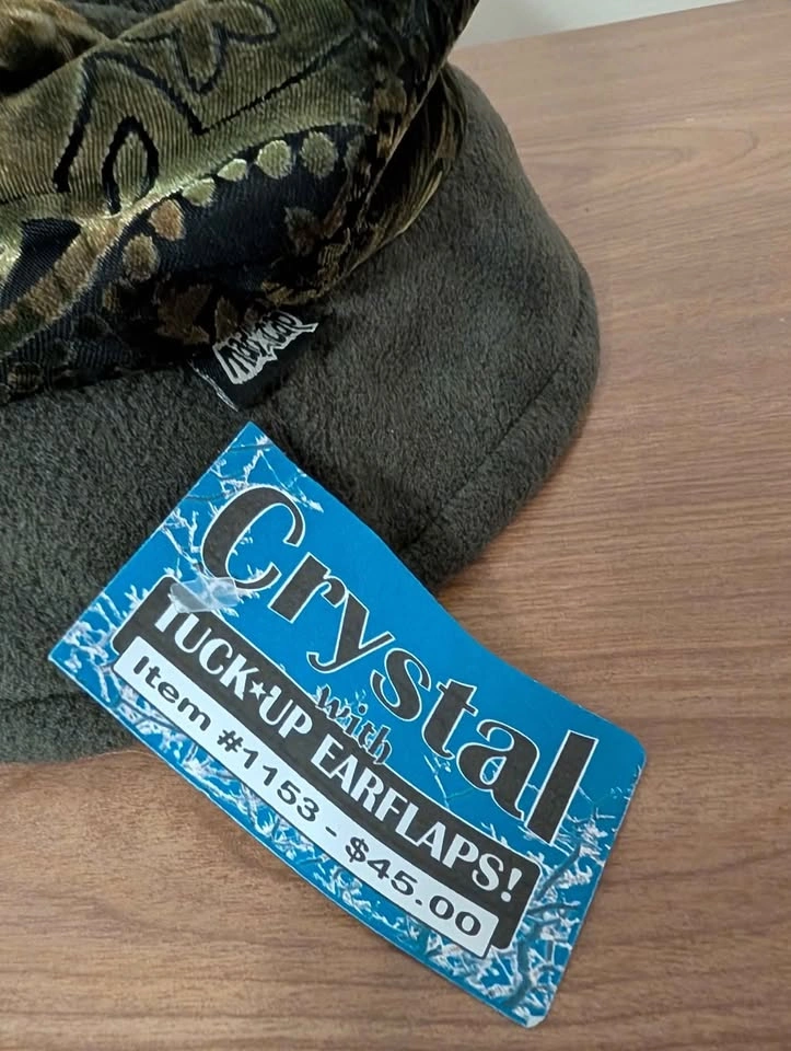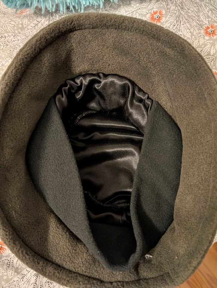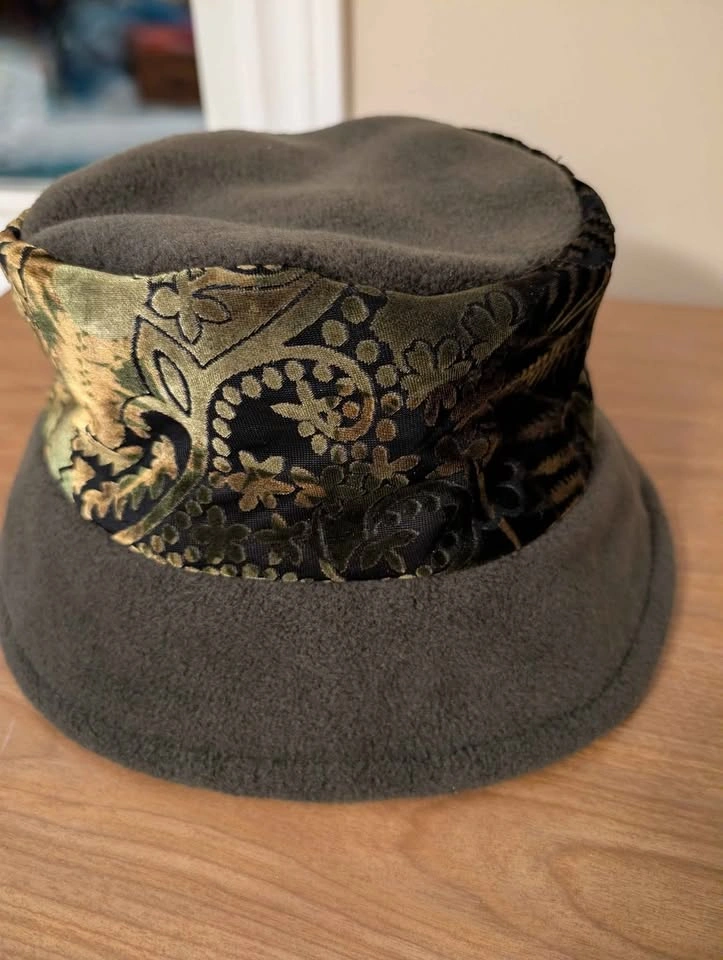 Muted green fleece hat with hidden ear flaps provides both style and warmth. A very one of a kind designer hat. North St Catharines pickup,cash only please