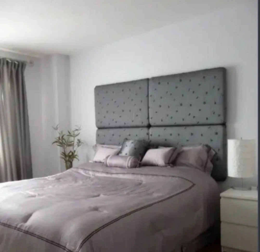 2 custom-made upholstered head boards in neutral grey luxurious fabric. Dimensions 24.5 x 38.5 inches (62 x 98 cm)- perfect for King bed mattress. Comes with hanging clip hardware, so everything is ready to go! There are 4 panels in pic, but I am only selling 2 panels which makes for sleek grounded look.