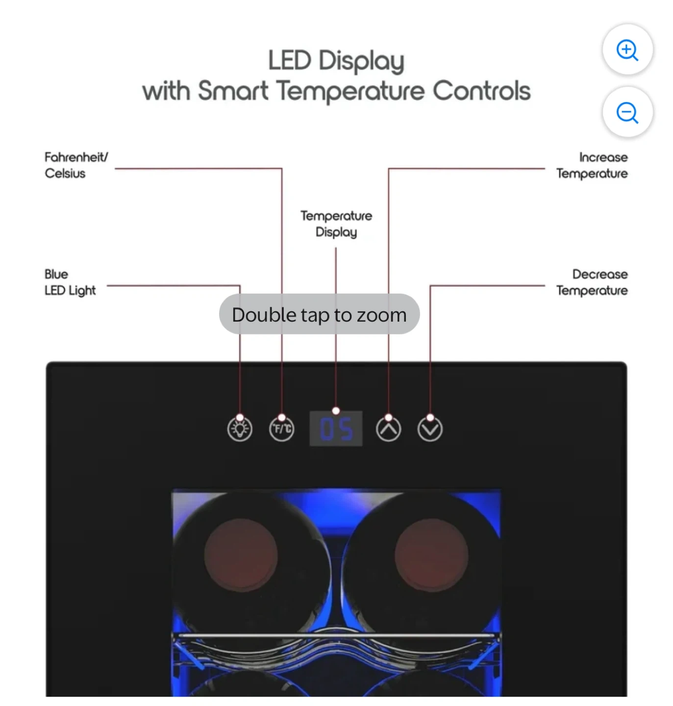 Soft LED Lighting: Soft blue LED interior lighting that showcases your bottles without damaging the wine