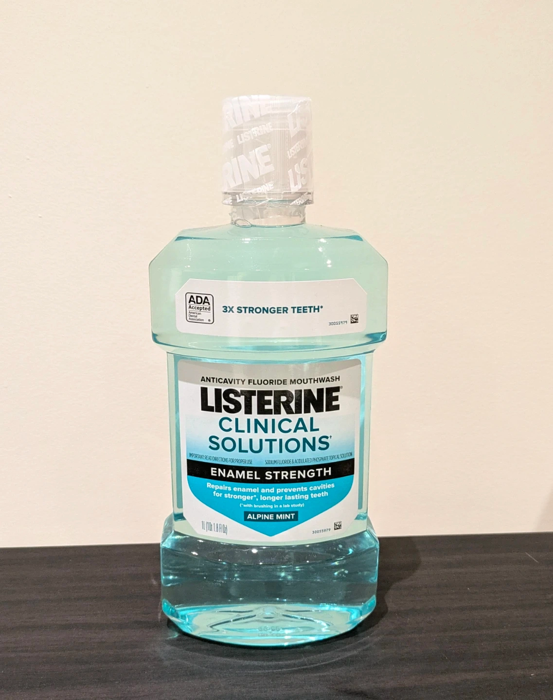 59Selling a brand new bottle of Listerine Clinical Solutions Enamel Strength anticavity fluoride mouthwash! It repairs enamel and prevents cavities for stronger, longer lasting teeth. Alpine Mint flavour. 1L (33.8 fl oz). Pick Up Markham - can arrange for exact location.