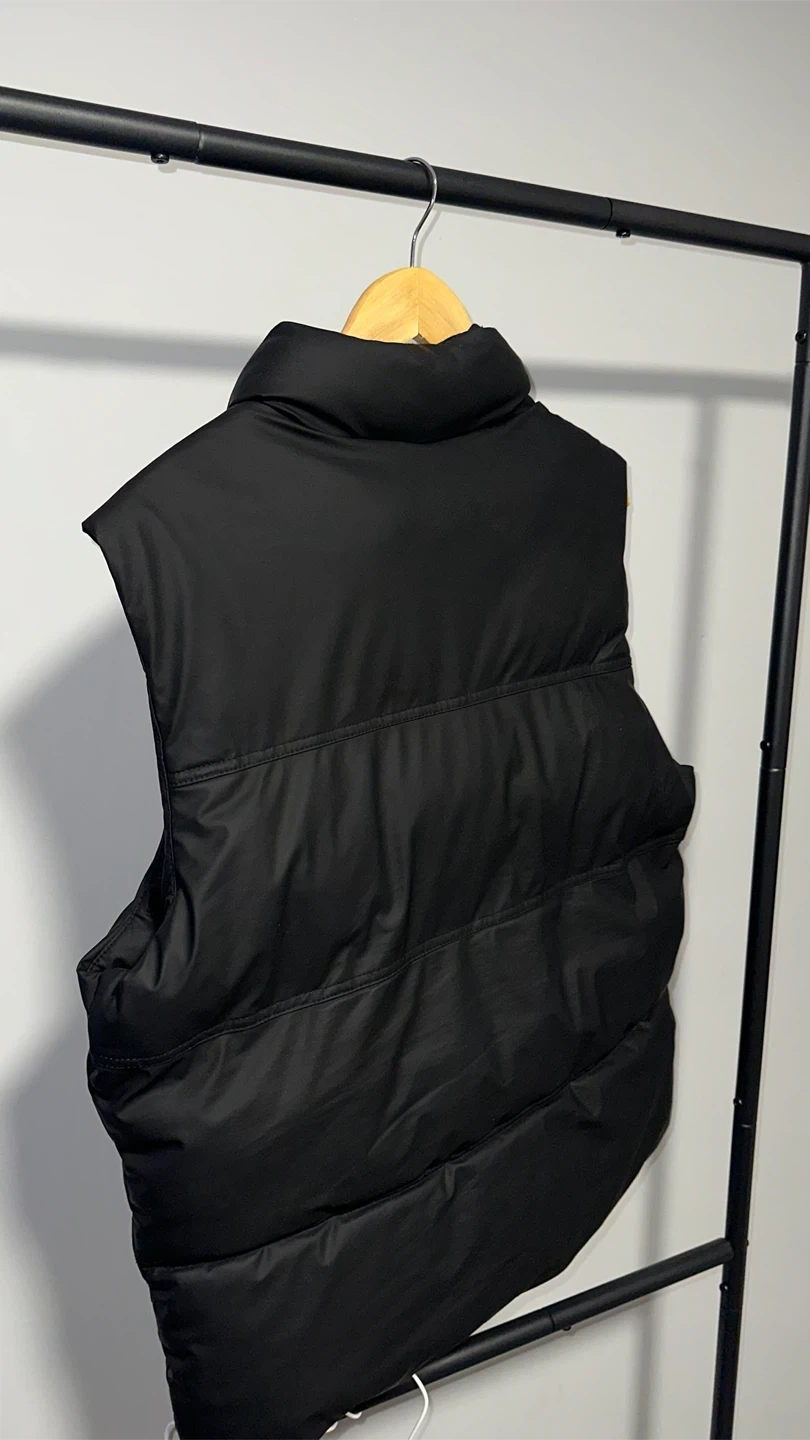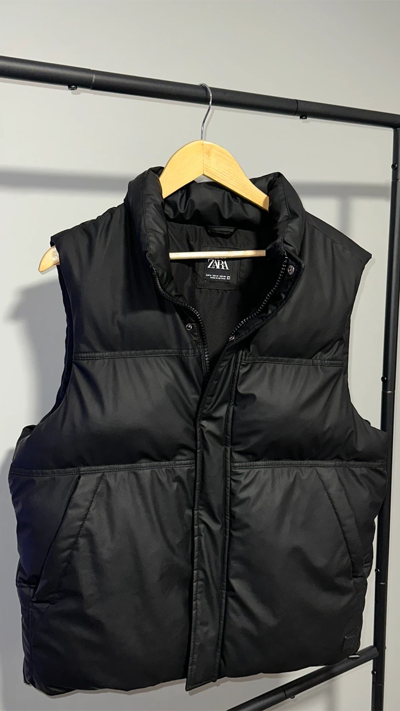 Selling a Zara black puffer vest in size medium. It's in great condition and perfect for layering during the cooler months. The vest is made of a comfortable material and features a full zip closure.