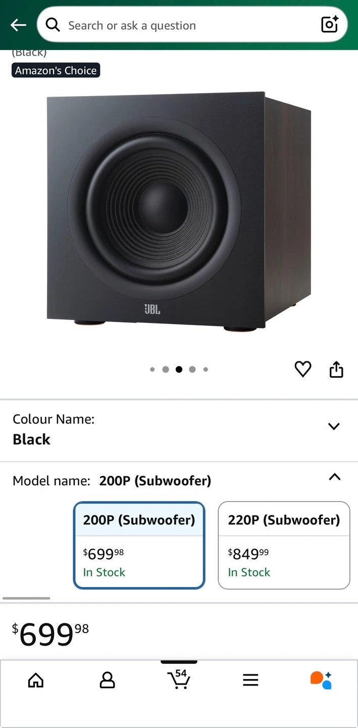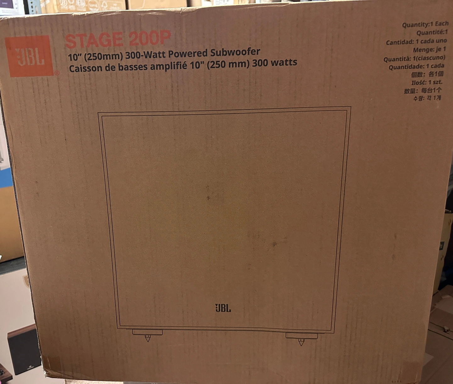 60JBL Stage 2 200P Black 10" 300 Watts Powered Subwoofer (Black) NOTE: New in box 10-inch (250mm) Polycellulose Ribbed Cone Low-Frequency Woofer 150W RMS (300W Dynamic) Dual Rear-Firing Tuned Ports Crossover, Level and Phase Control