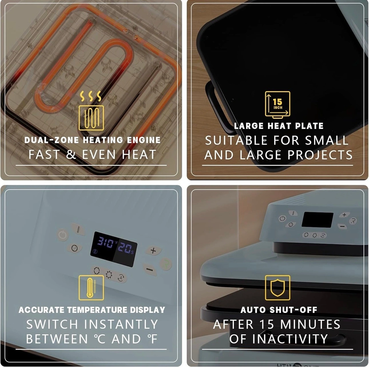 60Auto Heat Press Machine for T Shirts - 15x15 Smart T Shirt Press Machine with Auto Release - Professional Heat Press for Sublimation, Vinyl, Heat Transfer Projects, white Note: New in box 【Auto Heat Press & Free Hands】- HTVRONT auto heat press machine aims to take away the struggles of a regular heat press. After loading your project onto the shirt press machine, all you have to do is gently push the ironing board inside and press the "R" button to start. The heatpress will automatically press down and auto-adjusts to your project's thickness up to 1", and it auto releases once the timer goes down. Super easy to use and no more burned projects when you're away awhile 【Heat-up Fast & Evenly】- Our heat press 15x15 could reach a common-use temp of 320℉ /160℃ within 4 mins, twice faster as regular ones. And you will save nearly 130s when heating up to 410℉/210℃ compared with other auto heat press. Combined with NTC thermistor technology and a dual-tube heating engine, this t shirt pressing machine distributes heat evenly and holds the temperature well. HTVRONT large heat press allows you always have a clean and professional transfer 【Making More in Less Time】- If you're looking to level up your heat press game, scale up your production, start your own side hustle and even sell your crafts, the auto heat press is perfect for you! This tee shirt press machine has multiple practical modes: 4 fast modes, 2 custom modes and an auto mode, which make heat transfers quicker and simpler than ever! You'll be all set to customise clothing, accessories, décor, gifts and so much more, all with a professional-quality finish 【Safety Use & Auto-Off】- Safety is one of the biggest concerns with HTVRONT auto heat press. The ironing board is separated from heating plate, making it safer to use around your kids and pets. The drawer slide design ensures your hands are kept away from the hot plate. AND slide out heat press will automatically shut up if you don’t use it after 15 minutes. No worries you are going to burn the house down 【Wide Application & Great Service】- Not only is HTVRONT auto heat press great for t-shirts, totes, and apparel, it's also compatible with other materials like wood signs, and ceramic coasters up to 1" in thickness. Being FCC certificated