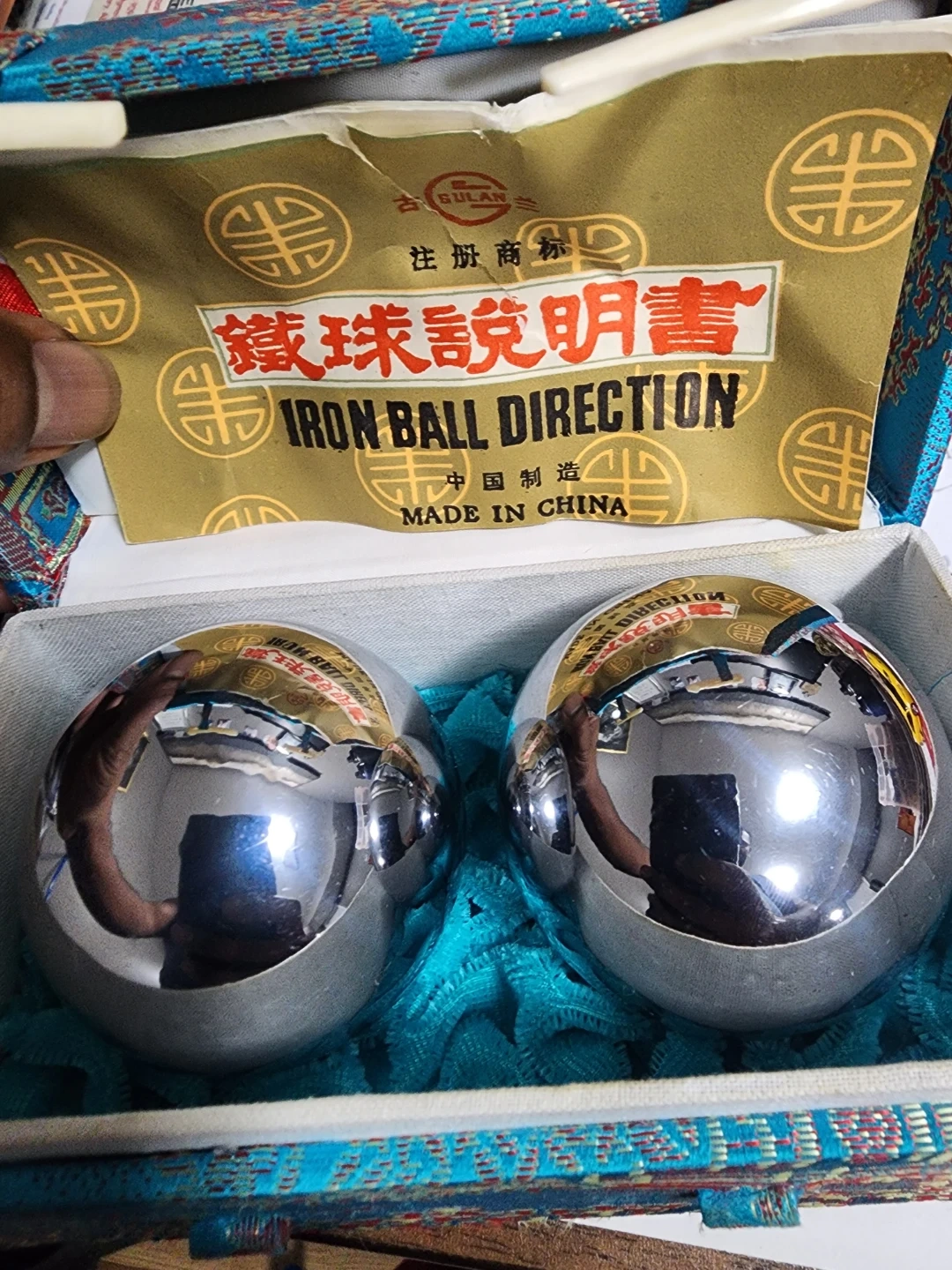 83Selling a set of Chinese Baoding iron balls, complete with their decorative box! These balls are great for relaxation and hand exercises. They come with the original direction leaflet as well