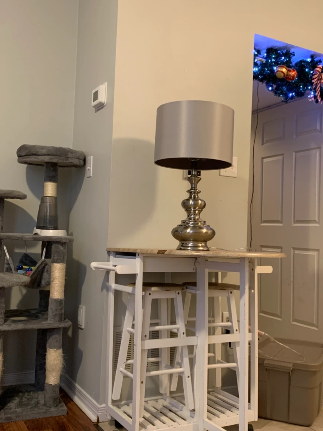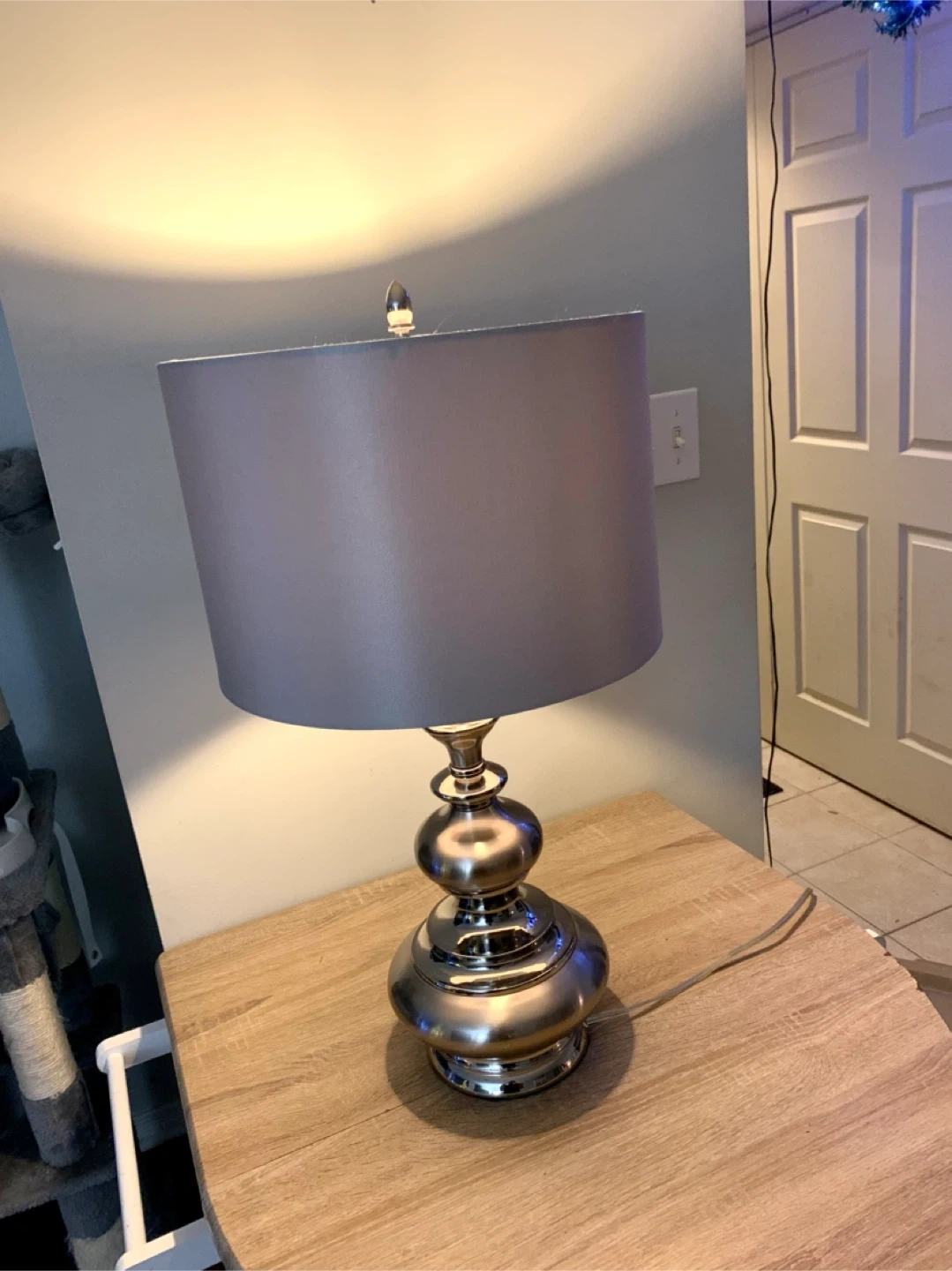 Selling a lovely silver table lamp! It's in great condition and would look great in any room of the house. It has a neutral lampshade and a decorative base.
