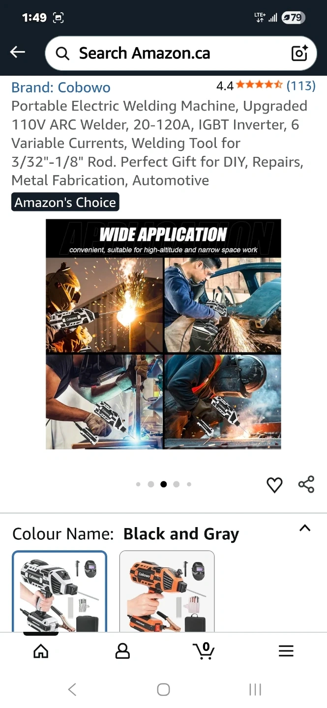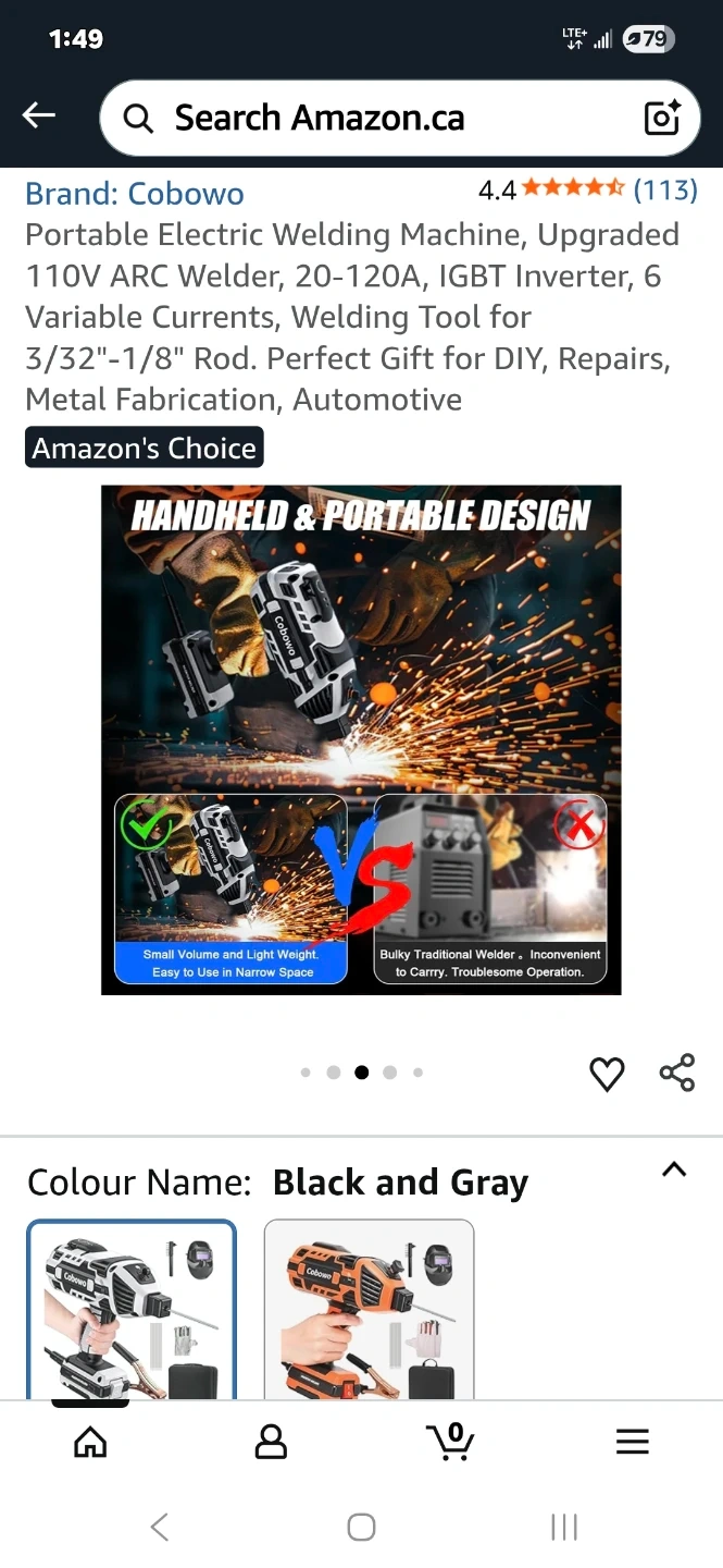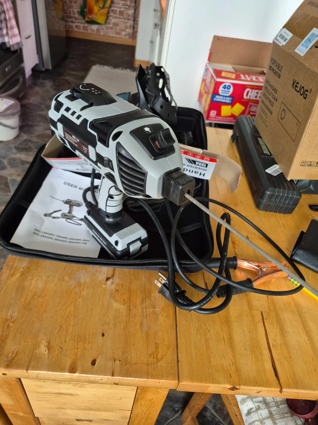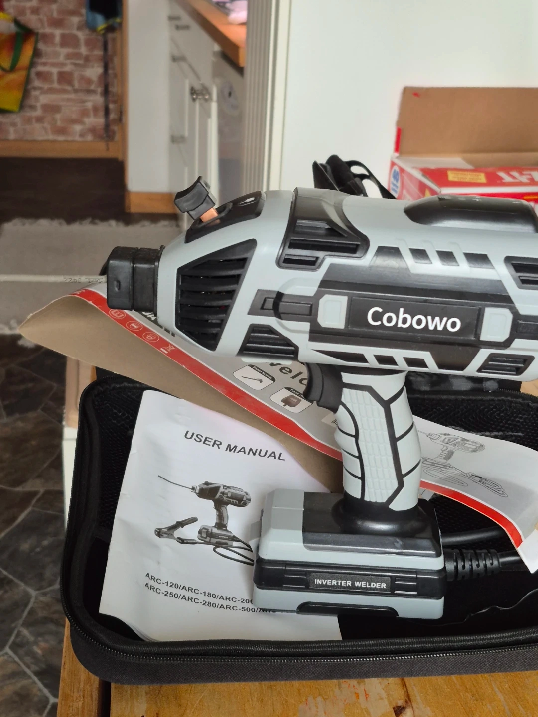 Selling a Cobowo portable electric welding machine in black and grey. It's an upgraded 110V ARC welder, 20-120A, with an IGBT inverter and 6 variable currents. It's a welding tool perfect for DIY, repairs, metal fabrication, and automotive work. It comes with a user manual and is designed to be handheld and portable!
