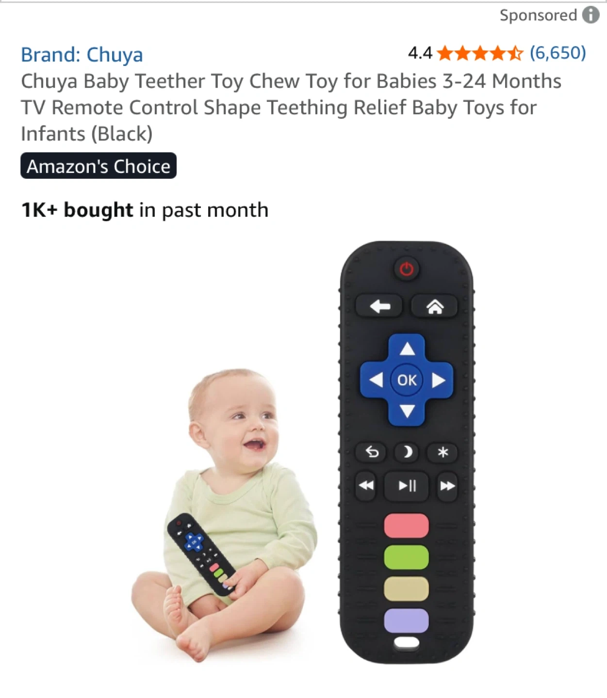 243This is a Chuya baby teether toy designed to look like a TV remote control! It's made for babies aged 3-24 months and provides teething relief. It's black and has fun, colourful buttons