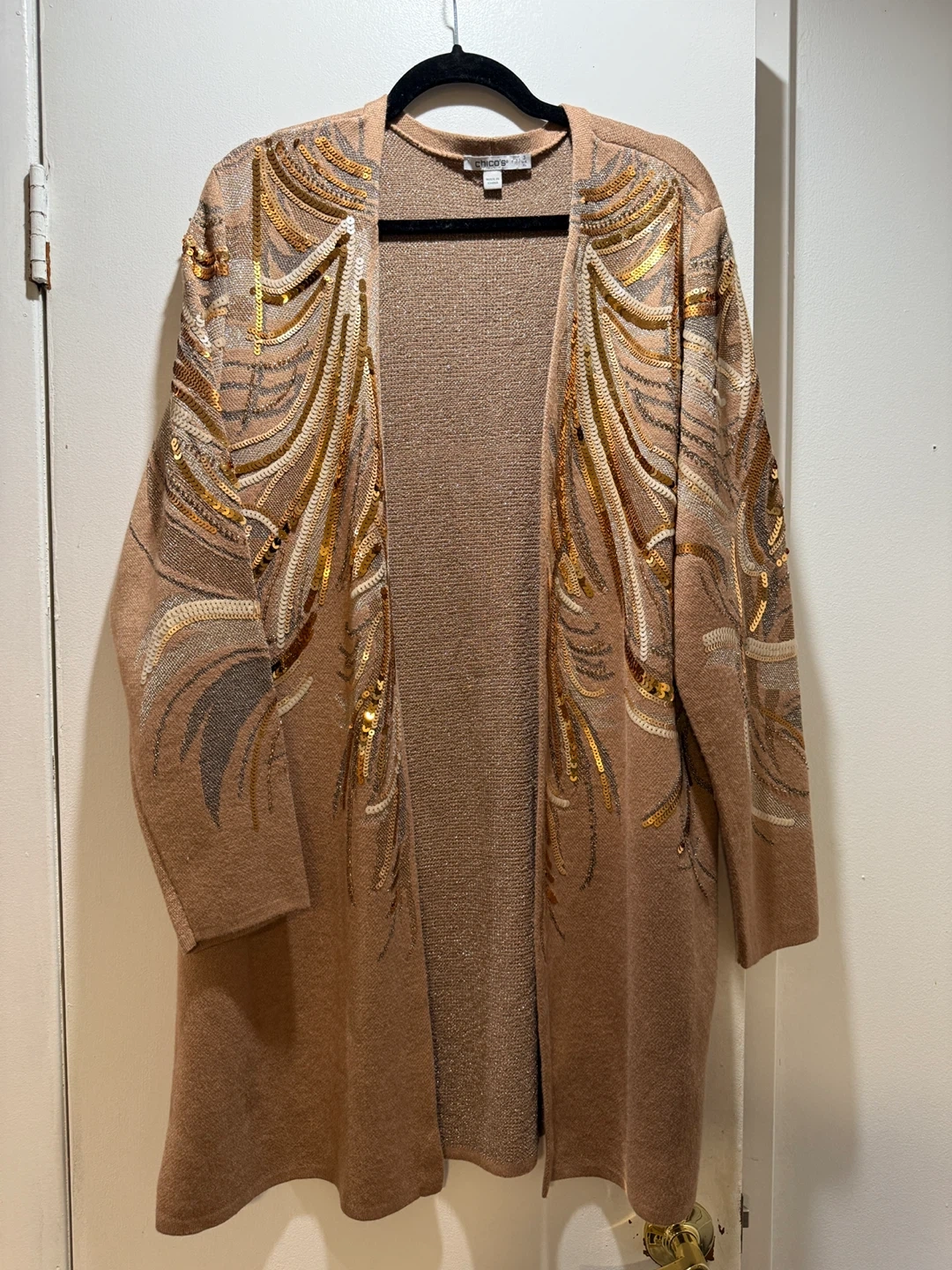 353Selling a Chico's cardigan in a size 3, which is equivalent to an XL. It's a beautiful neutral color with lovely embellishments. Perfect for adding a touch of sparkle to any outfit!