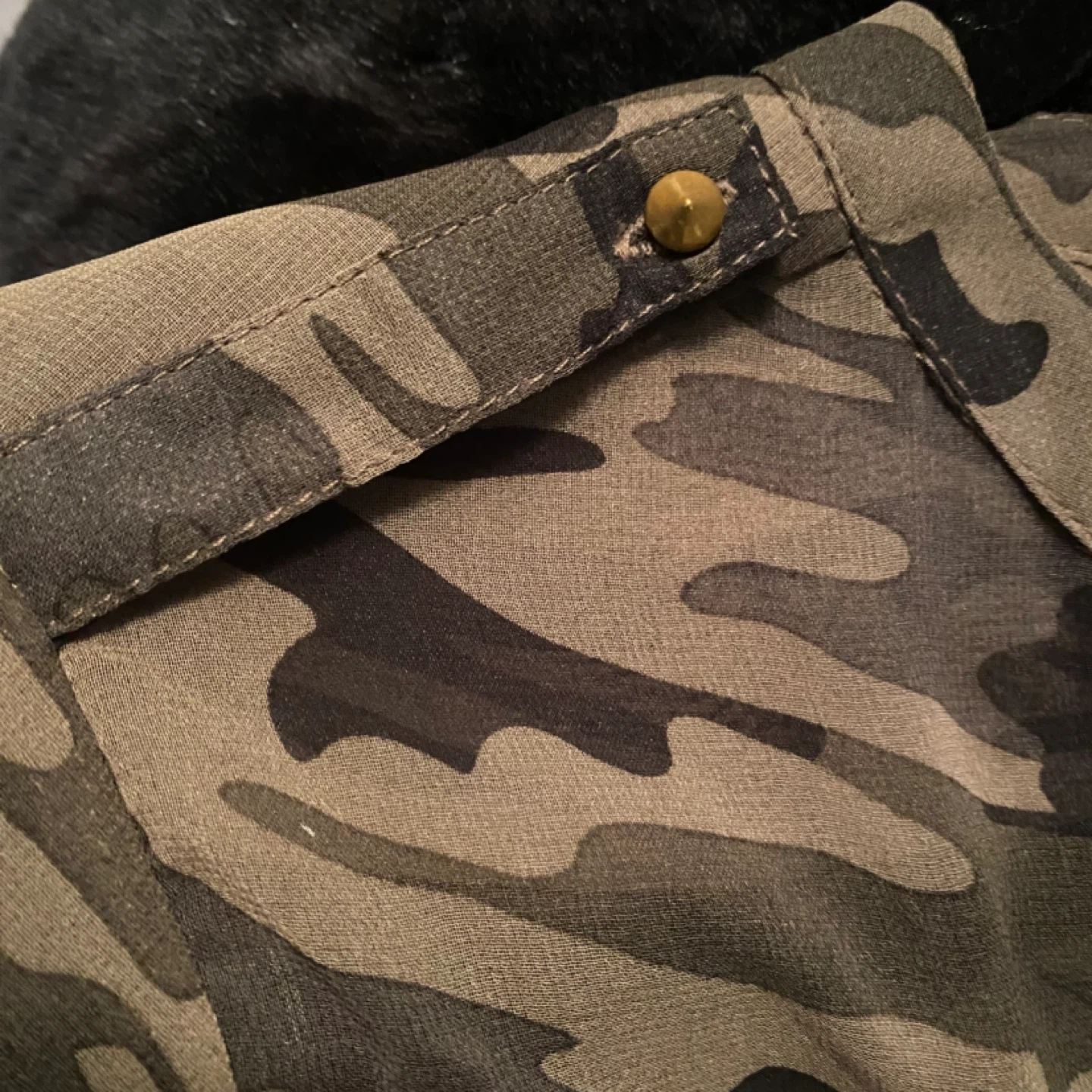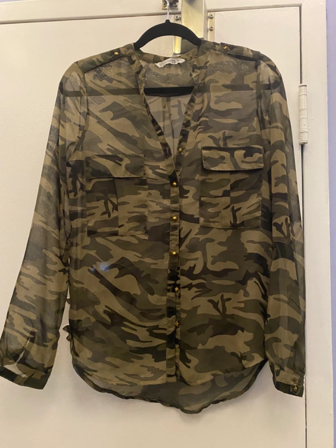 Selling a Bluenotes blouse in a semi-sheer camo print. It's a size M. Has adorable tiny goldtone studded buttons down the front and on the shoulders. This top is in excellent like-new condition, no damage or stains. Has been freshly washed and safely stored.