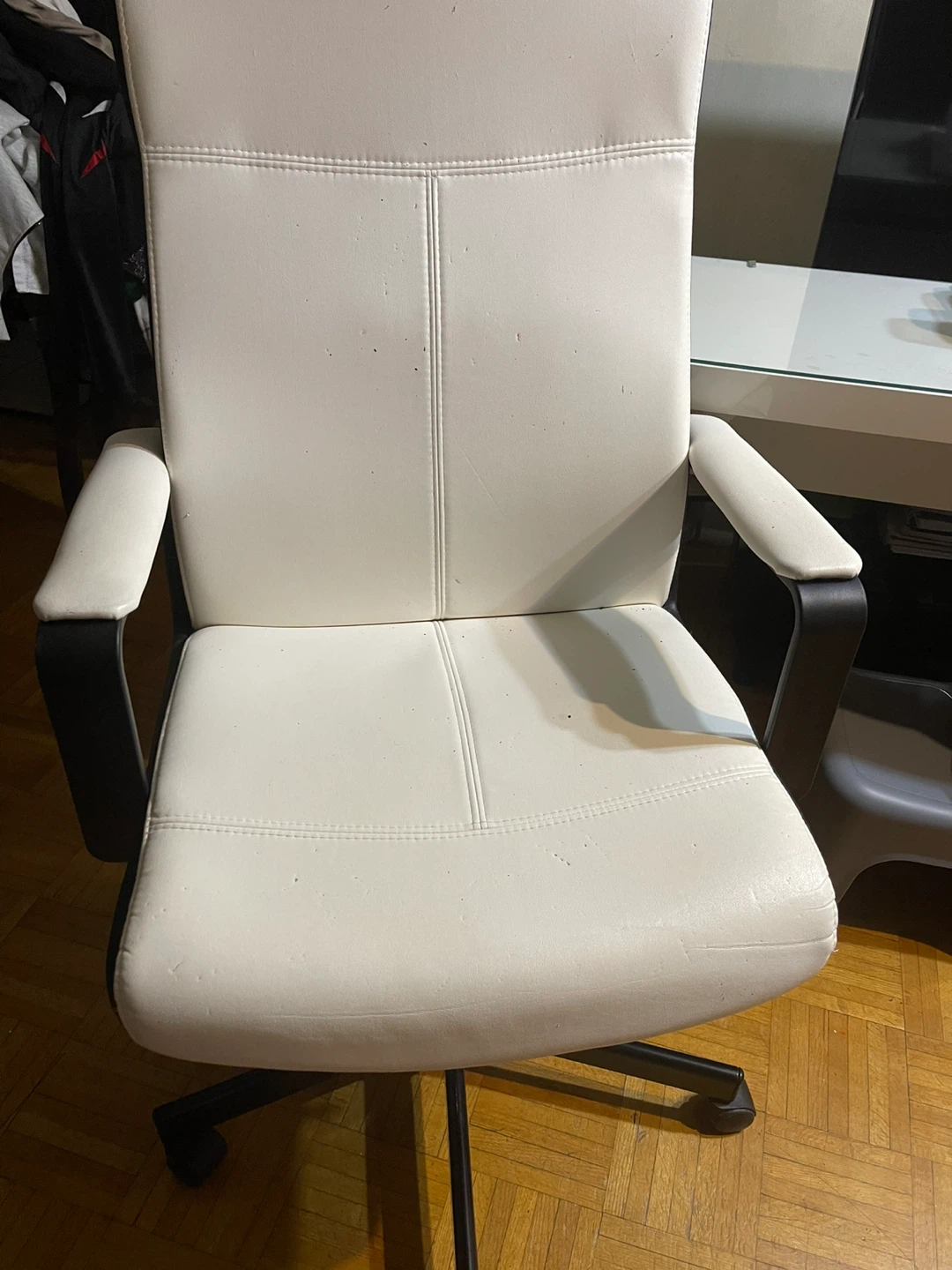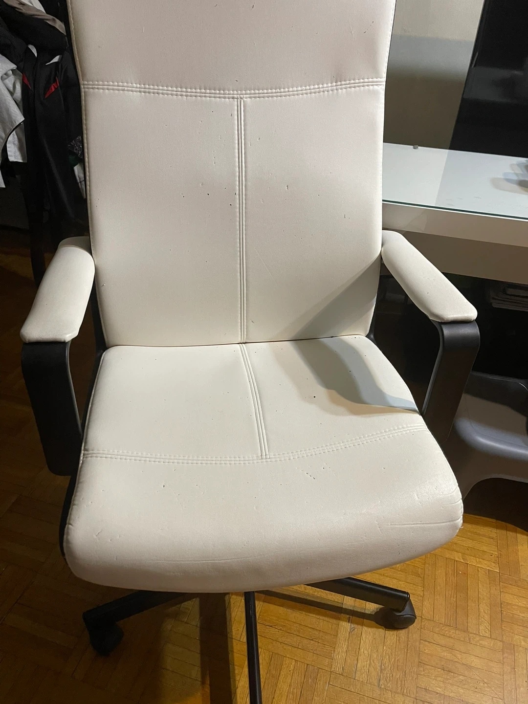 Selling a comfortable office chair with a white seat and back, and a black base. It's perfect for working from home or for your office space. It does show some signs of use.