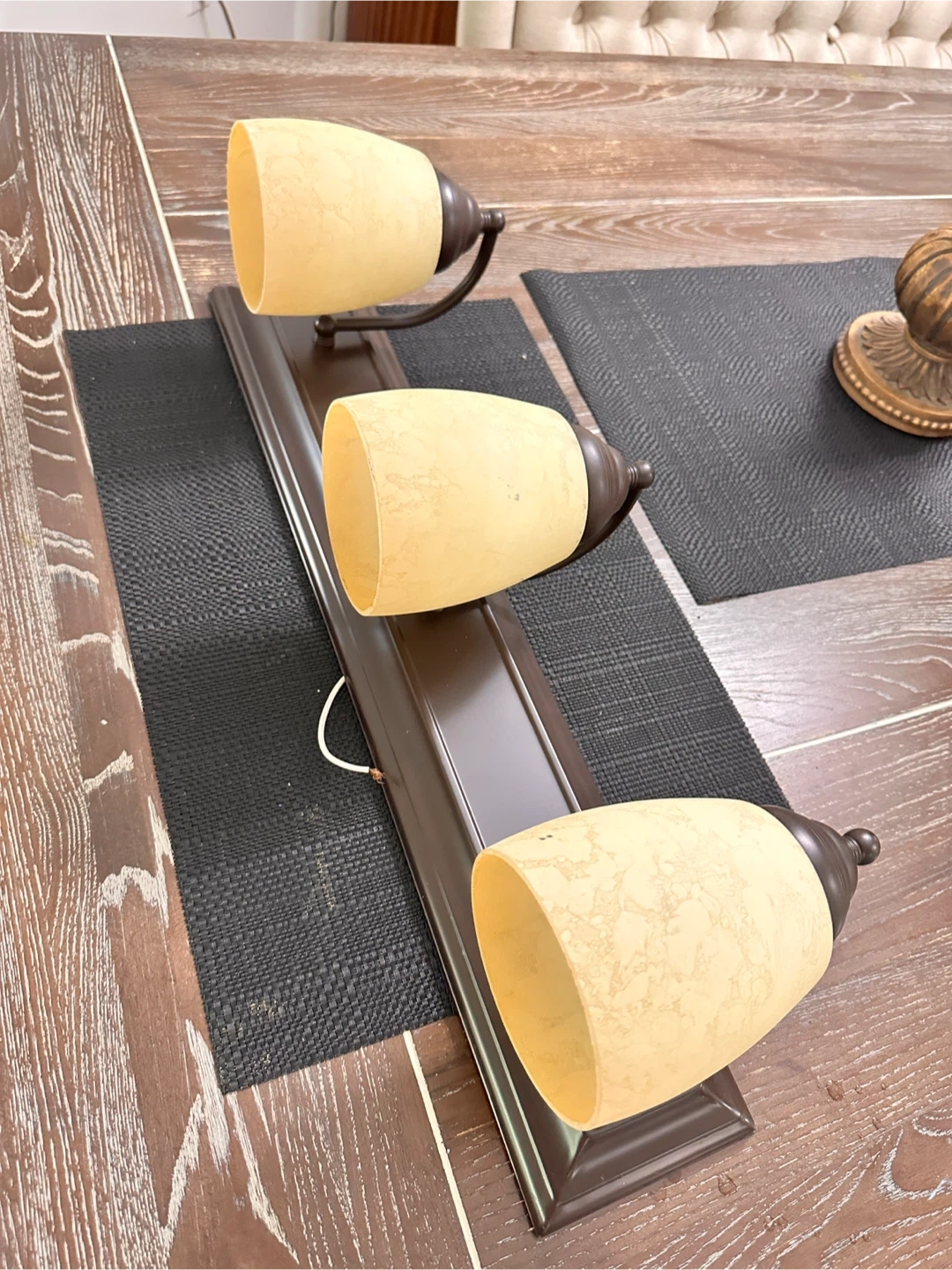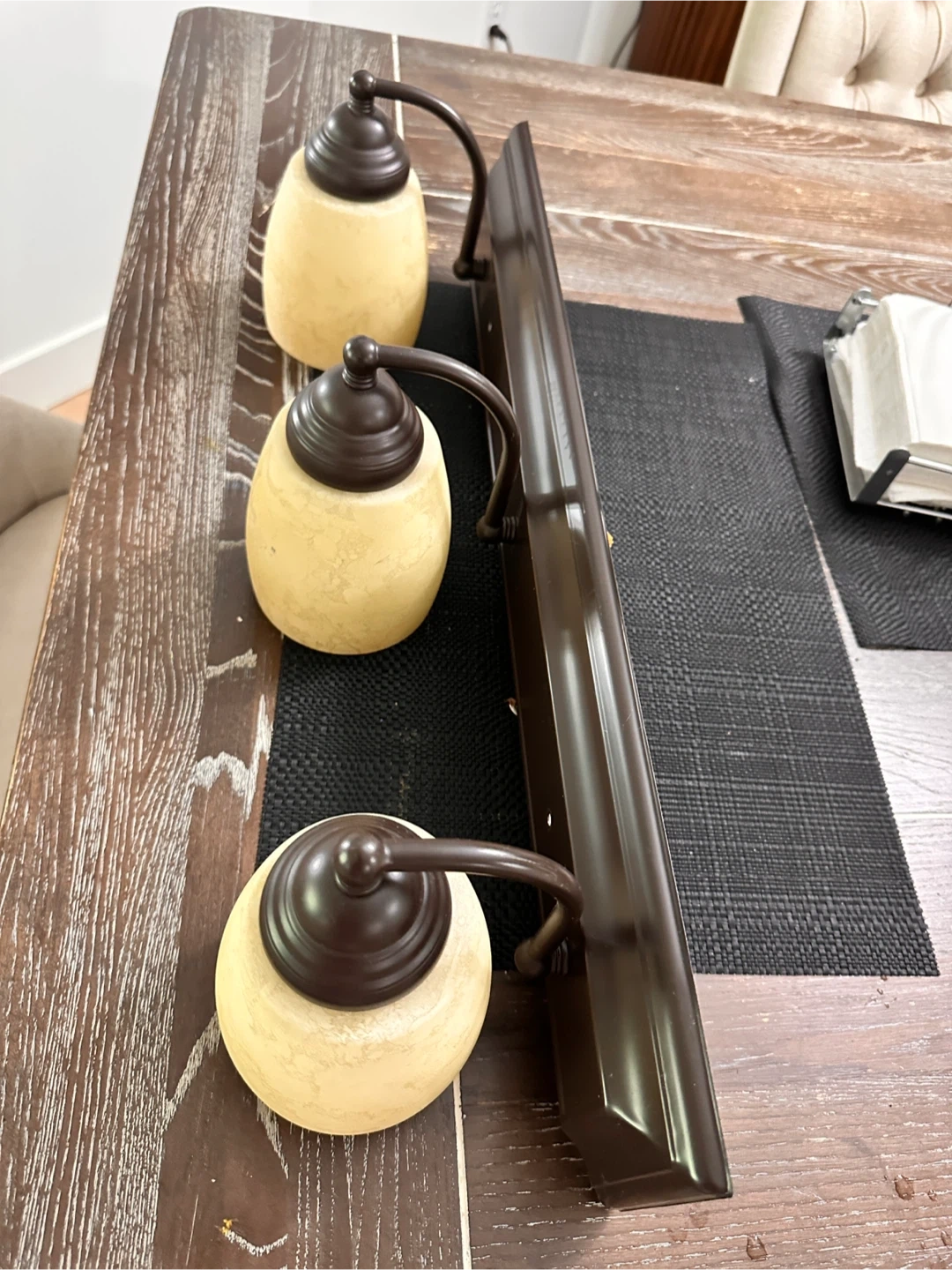 Selling a 3-light vanity light fixture. It features a bronze finish and cream-colored glass shades. Perfect for adding a touch of elegance to your bathroom!