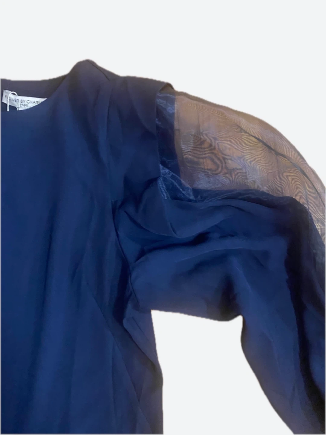 Made by River by Charles Nolan. It’s a lovely shift style, relaxed fit dress. It’s stylish and demure. It features sheer sleeves with tie details at the wrists. It's in great condition and ready for a new home!