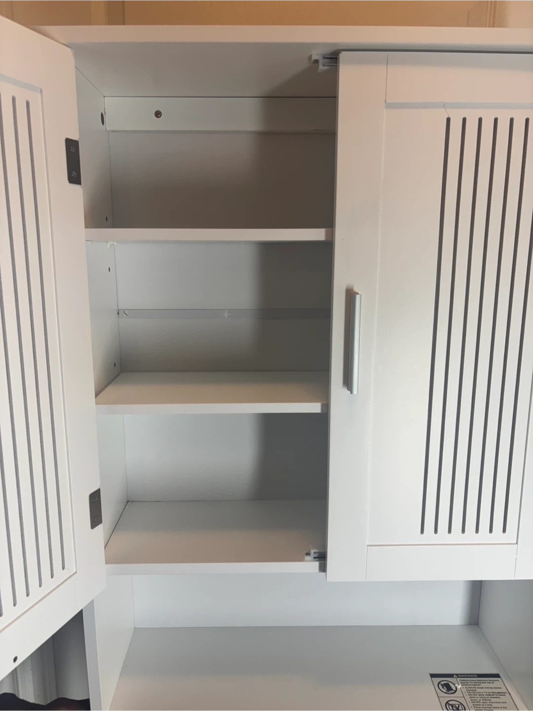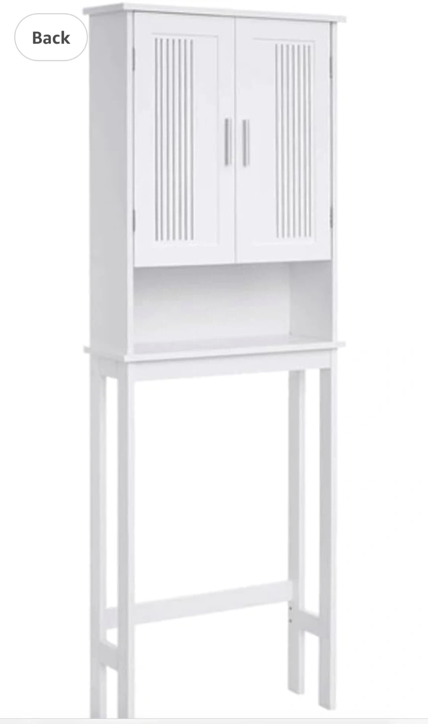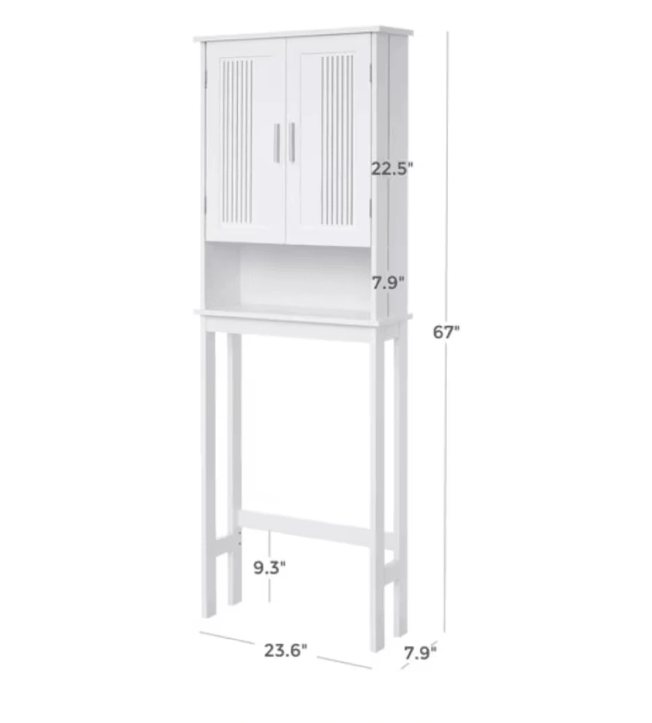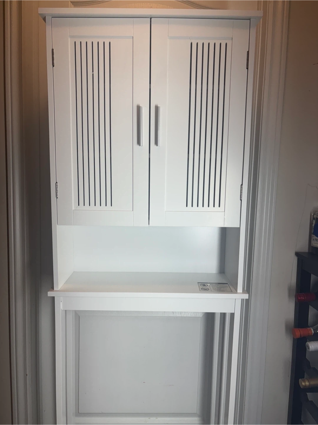 Selling a white over-the-toilet storage cabinet. The dimensions are approximately 22.5" wide, 7.9" deep for the cabinet, and 67" tall overall. Perfect for adding extra storage to your bathroom! Available for pickup and delivery