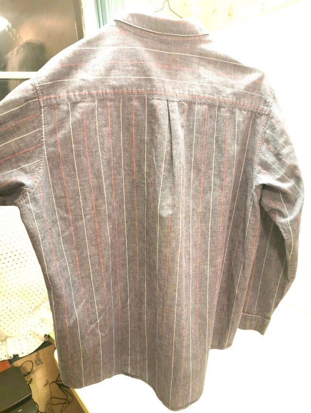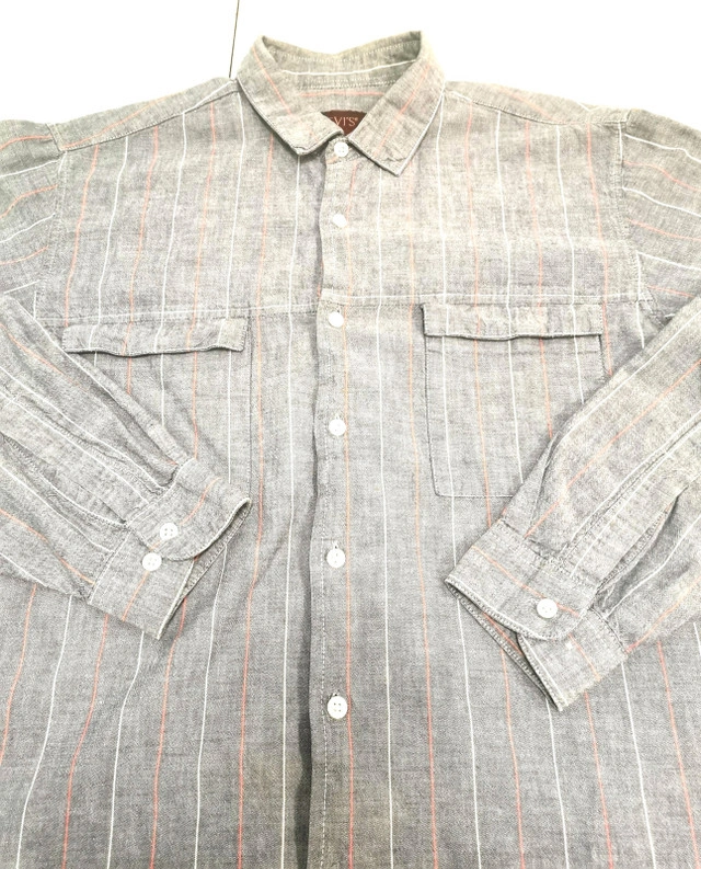 Levi's Men's Large Vintage Long Sleeve Oversized Button-Up Shirt in Gray with Blue Pin Stripes. Made of comfortable cotton fabric with a relaxed fit and band collar. Features button accents and an 80s theme. A casual, stylish choice for men's clothing. NOTE: Good vintage condition regular wear please reference photos as part of the description.