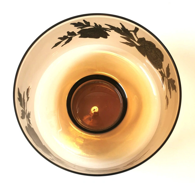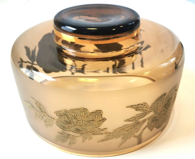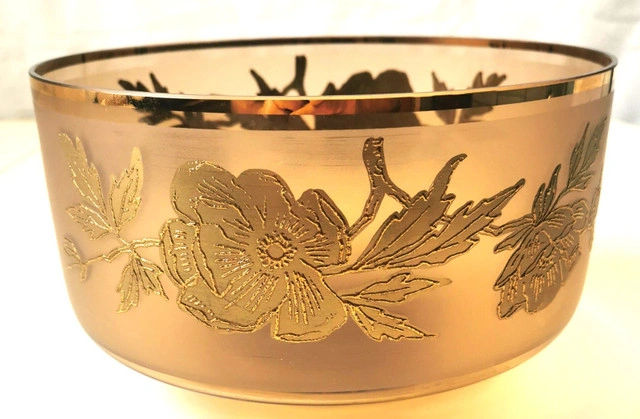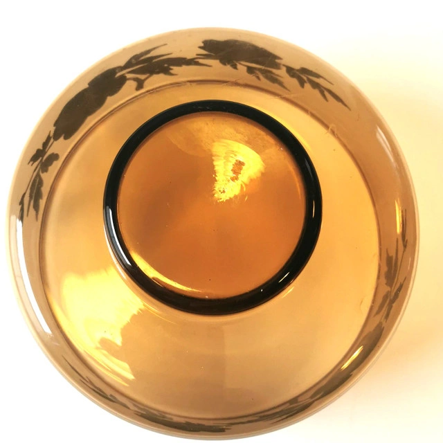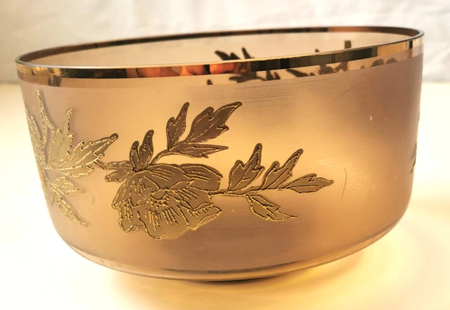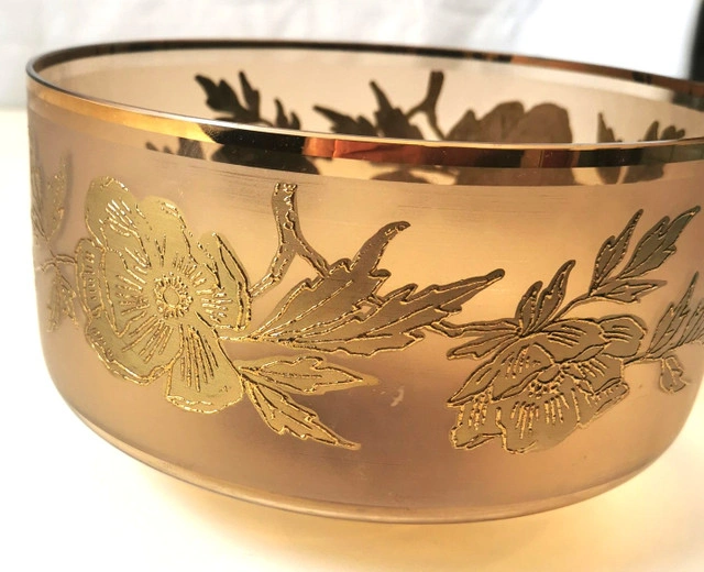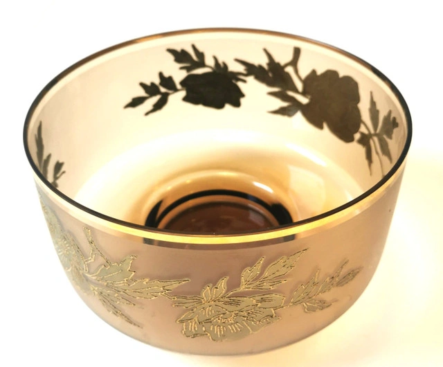 This vintage serving dish features a round shape with a gold gilt band and floral accents on amber glass. It is a decorative piece perfect for serving food or displaying. The elegant design and rich gold color add a touch of sophistication to any table setting. Dimensions- Height 4.75 inches, Diameter 8 inches. NOTE: Good condition regular wear based on age.