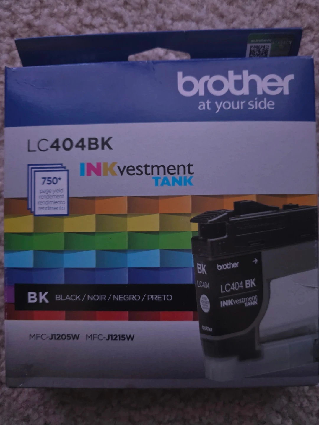 Selling a Brother LC404BK black ink cartridge. It's designed for use with MFC-J1205W and MFC-J1215W printers. The cartridge is part of the INKvestment Tank system and offers a page yield of 750 pages.
