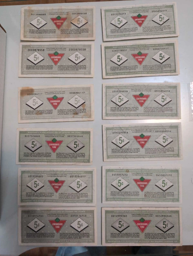 Here's a nostalgic throwback: a collection of Canadian Tire money, specifically the 5-cent variety! These vintage bills are a piece of Canadian history and a fun collectible. They are used, showing their age. Some have creases, but overall in fair condition. If the ad is up, they're still available!