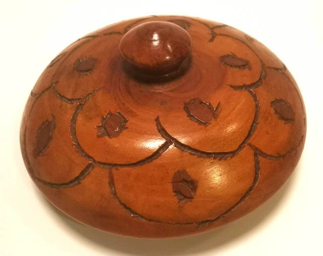 Crafted with care, this vintage Acorn Hardwood Lidded Container boasts a timeless round shape and a medium size, ideal for storing small treasures or keepsakes. The warm brown color and stained finish highlight the natural beauty of the wood, while the hand-carved details add a touch of individual charm to this 1970s-style piece. The container's sturdy construction ensures durability, and its unique acorn subject makes it a delightful addition to any collector's array or as a whimsical accent piece in your home decor. Whether for personal use or as a thoughtful gift, this wooden treasure chest evokes a sense of nostalgia and craftsmanship. Dimensions: Height 5.25 inches, Diameter 4.25 inches NOTE: Good vintage condition knot in the wood under the lid as seen in photos