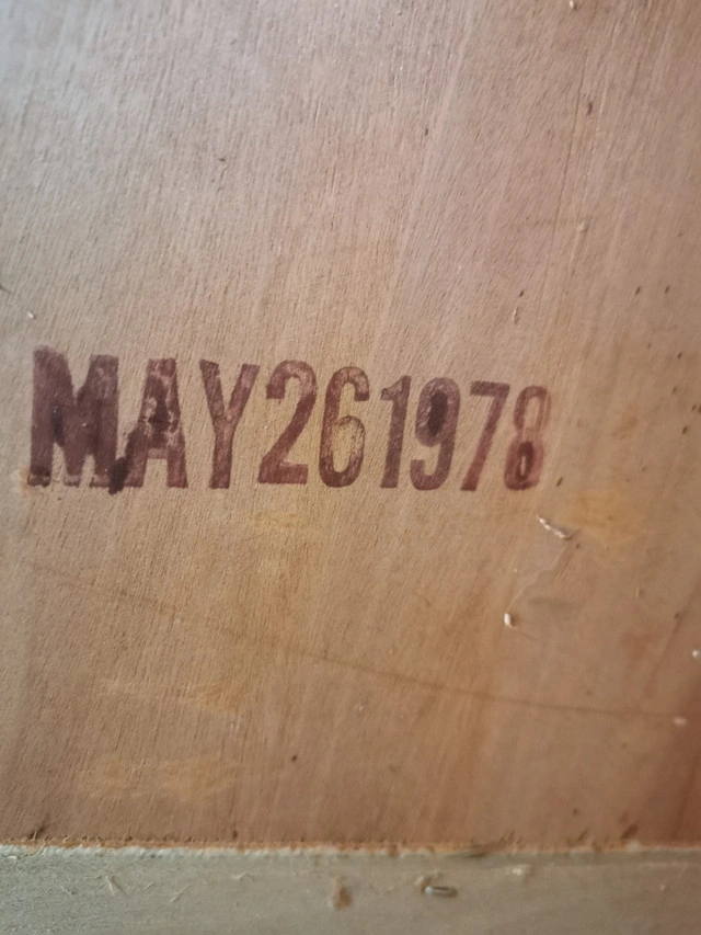Add a touch of vintage charm to your home with this authentic Goldcrest Furniture Ltd. piece, made in Toronto, Canada, and stamped with its original manufacturing date: May 26, 1978. Features: Made from quality wood with a warm, rich grain Original hardware and dual-door front Great as a record cabinet, media console, or side table CONDITION: Sturdy, clean, and in good vintage condition. Some wear and small chips please reference detailed photos. Distinct mid-century / late 70s style Cleaned and ready for a new home. This is a rare, well-preserved piece from a respected Canadian maker.
