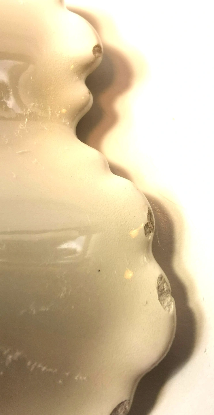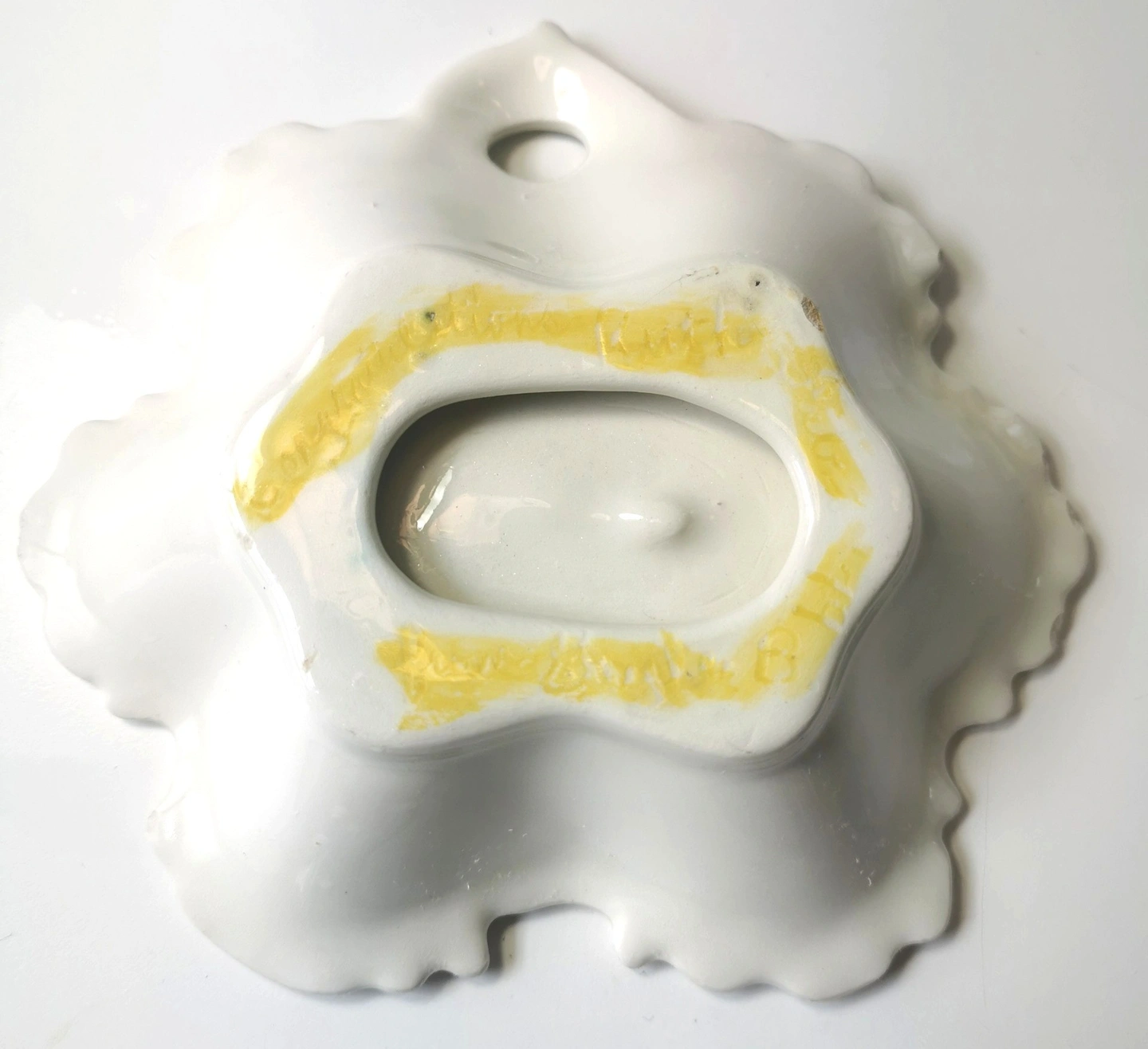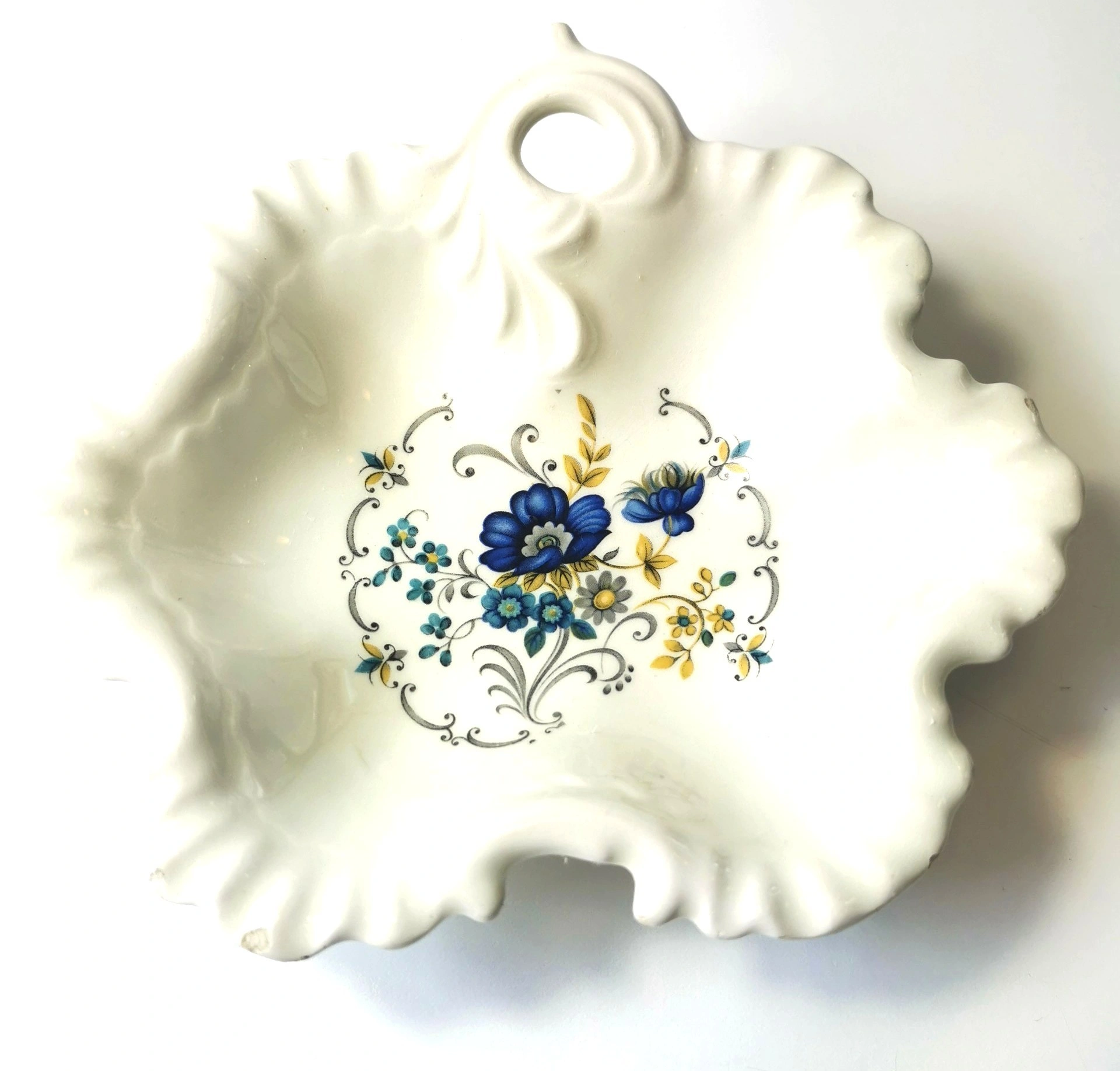 Made in France classic candy dish with botanical theme, scalloped edges. Dimensions: Length 6 inches, Width 6 inches, Height 1.25 inches. NOTE: Vintage item some small chips on edges predominantly on underside please reference photos.