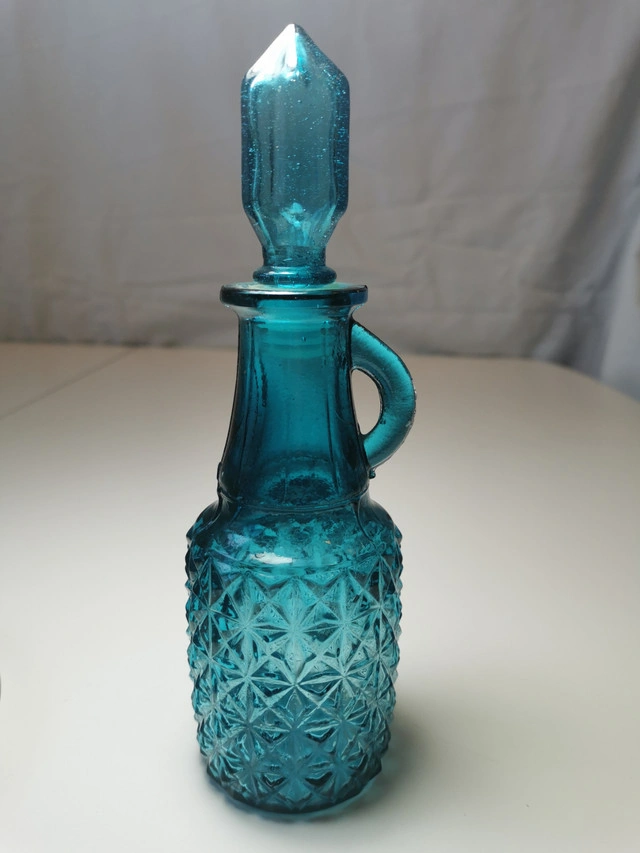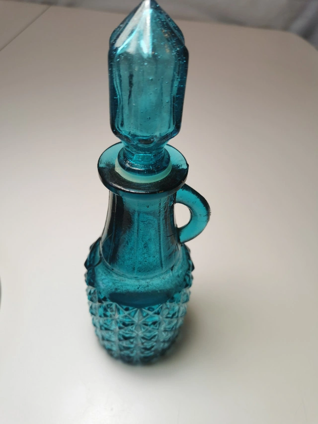 Beautiful vintage blue glass container or display piece. Vintage condition, chip as per photos, otherwise light wear. Dimensions: 8.75 inches height, 3 inches diameter at widest point. Meetup is in Bradford, I work from home and can meet anytime with a bit of notice.