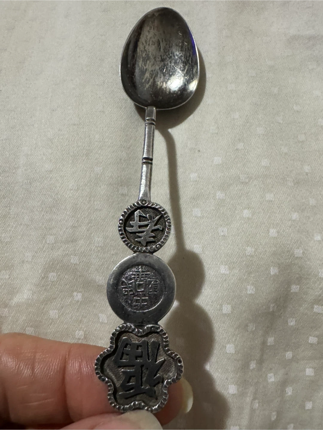 Selling a vintage KMS silver spoon. It has some unique designs on the handle. The spoon is marked "KMS" and "800", indicating its silver content. It's a lovely piece for collectors or anyone who appreciates vintage silverware