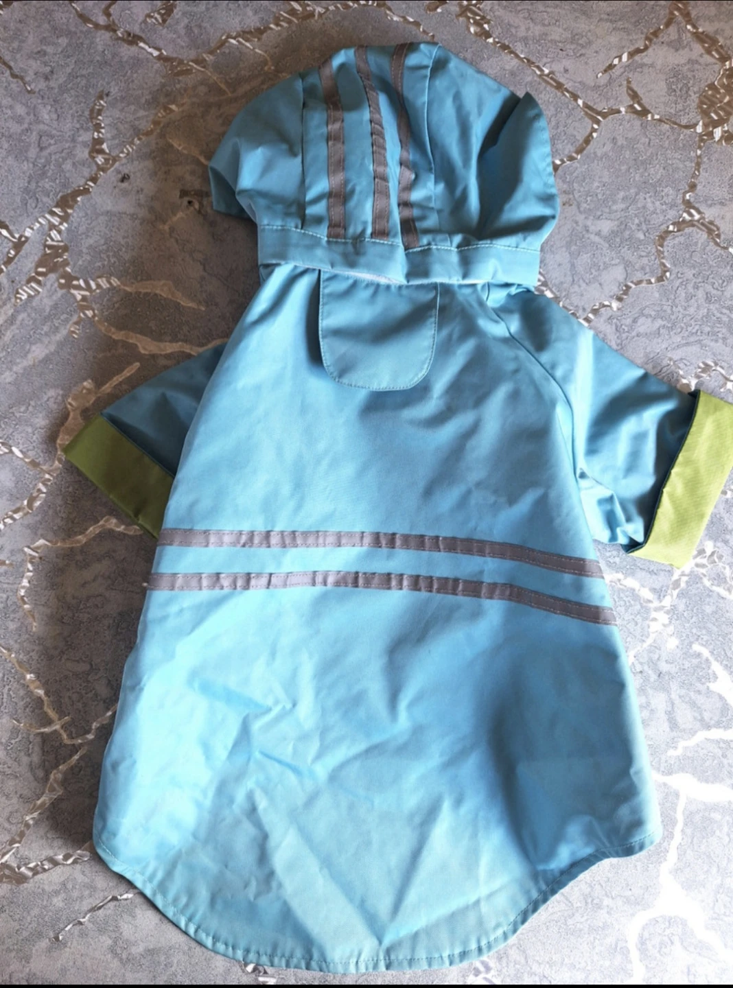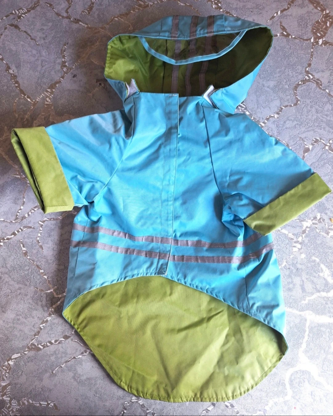 For your Dog a Blue / Green Reversible Vinyl Rain Coat with removable hood and clear plastic visor.. Size Small/Medium pet. Your welcome to bring your pet to see if it fits, used sparingly on our 17 pound Shih Tzu. Comes from a smoke free home.