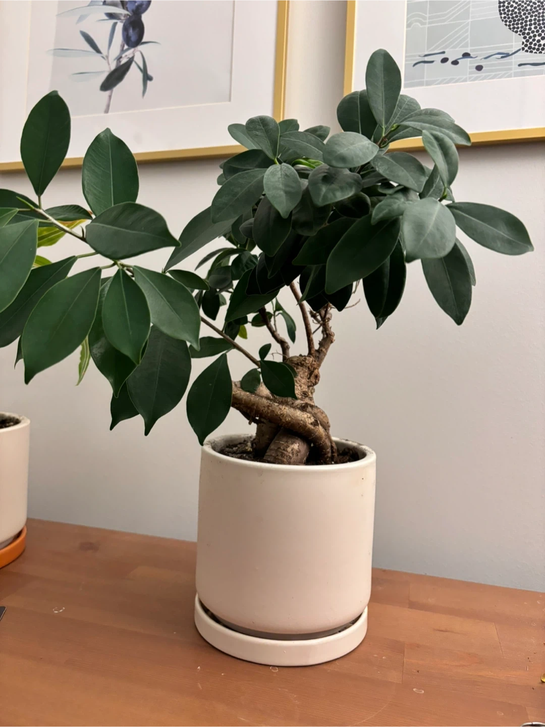 Bonsai tree is in good condition and features a robust trunk with lush, green foliage. It comes potted in a clean, light beige ceramic container, perfect for any decor. This item is in used condition, and has been loved in my home for a few years.