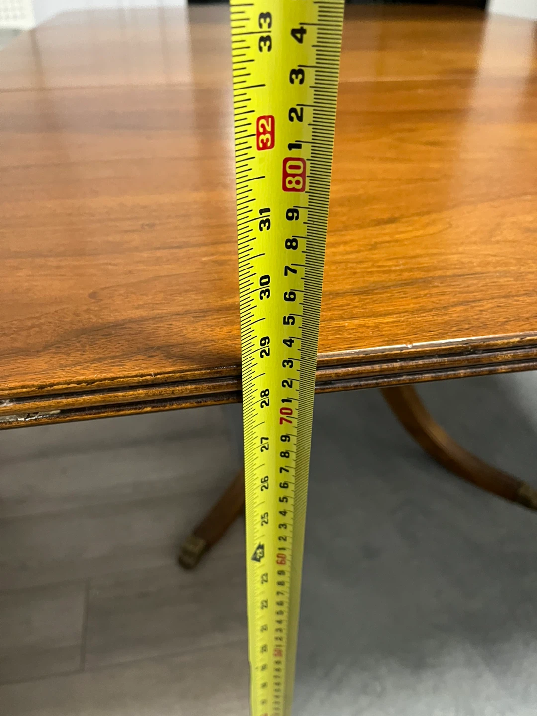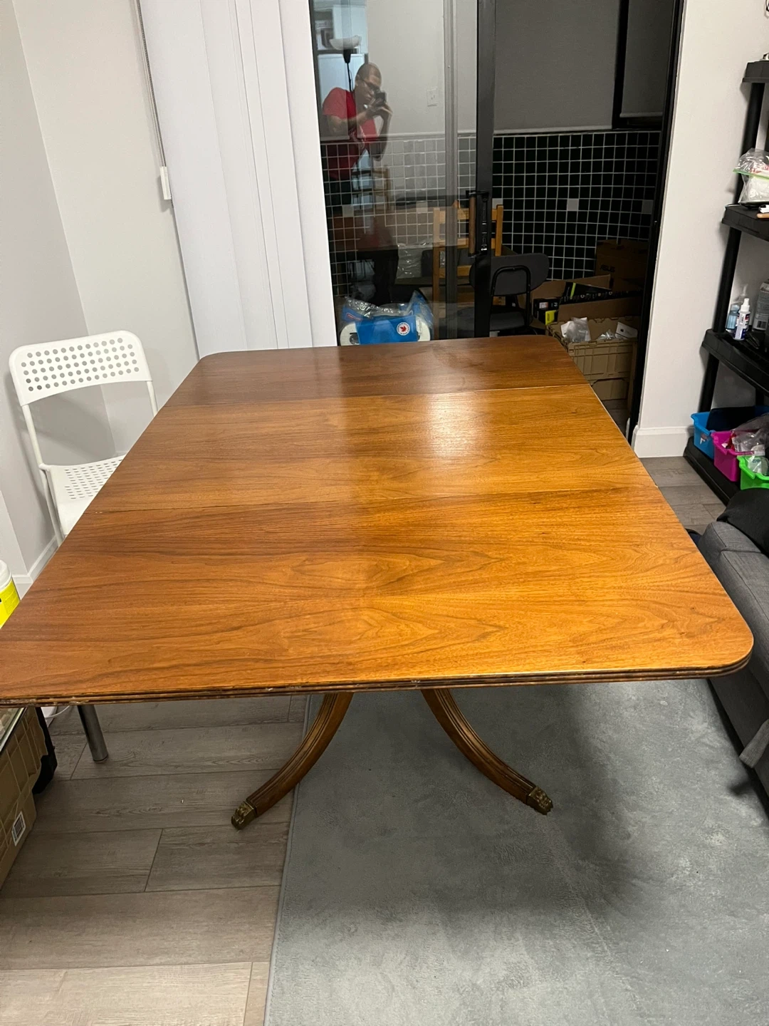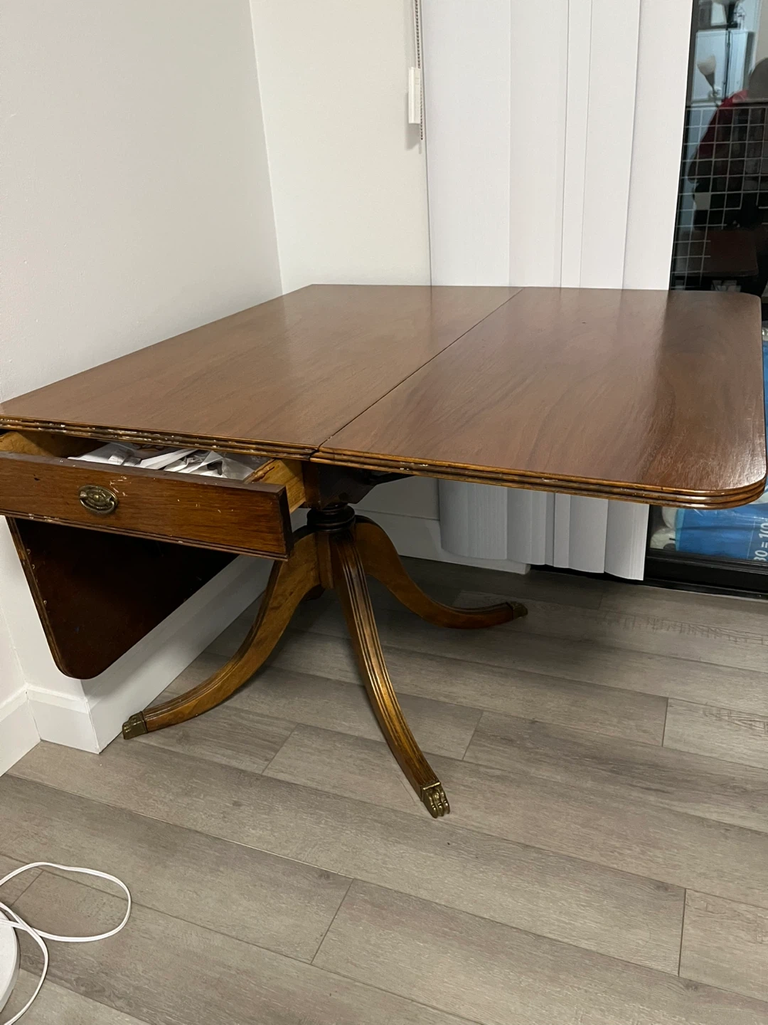 Selling a vintage brown wooden dining table. The table measures approximately 150cm in length, 80cm in width, 72cm in height . It features a unique pedestal base with elegant leg details. A drawer is included for extra storage! Pick up only.