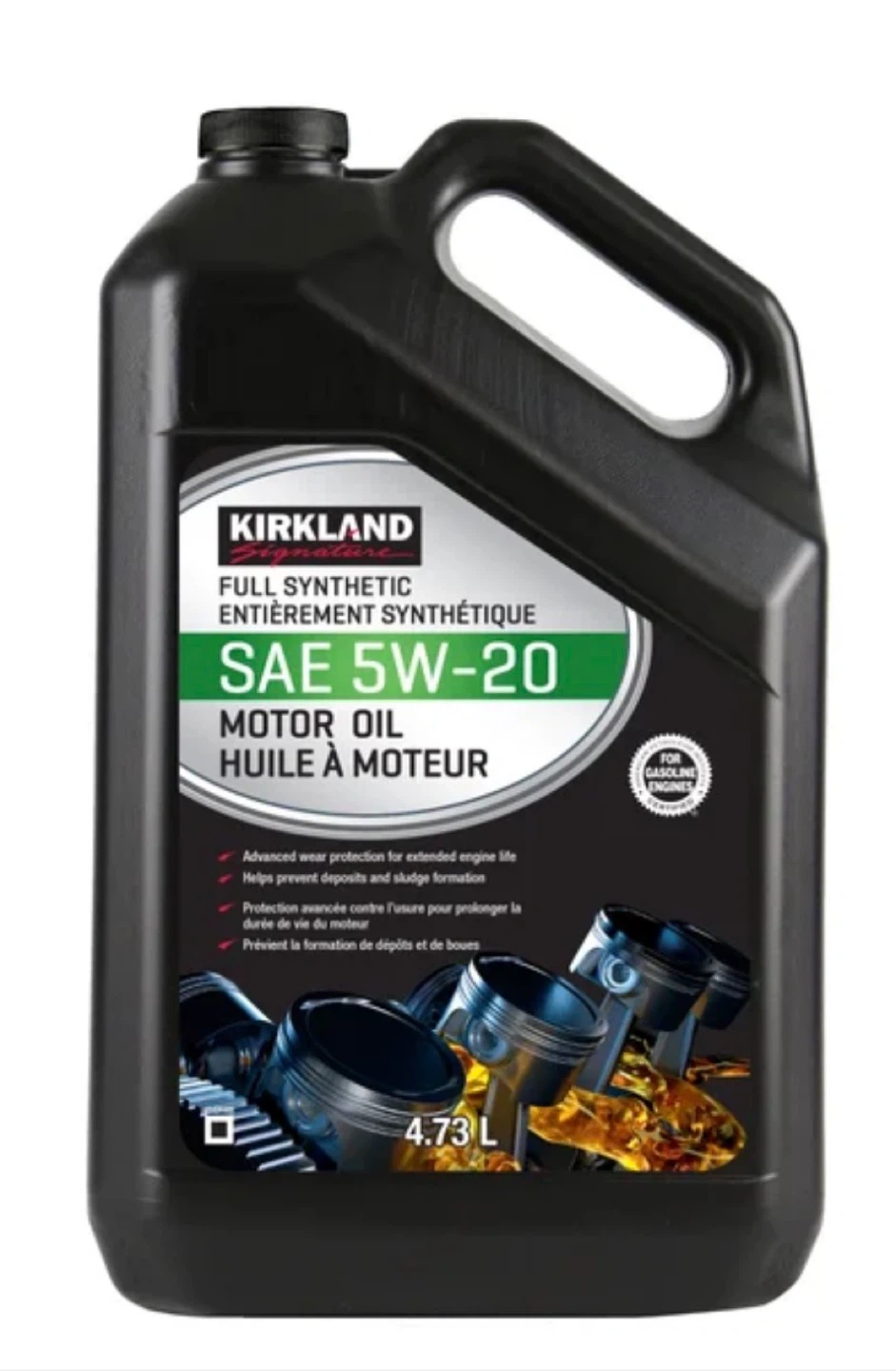 Selling a jug of Kirkland Signature SAE 5W-20 full synthetic motor oil. It comes in a 4.73L (5 Quart) container. This oil is suitable for gasoline, ex-fuel, or gasoline-electric hybrid vehicles requiring SAE 0W20. It also meets or exceeds SAE 0W20 API SN PLUS, SN, SL and ILSAC GF-6A specifications, providing better performance and protection in high and low temperatures.