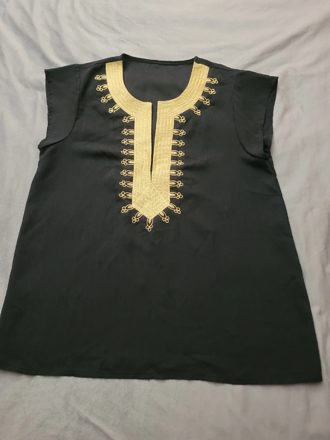 This is a black tunic top, size large, with gold embroidery around the neck. It is made of 95% polyester and 5% spandex, and is in good condition.