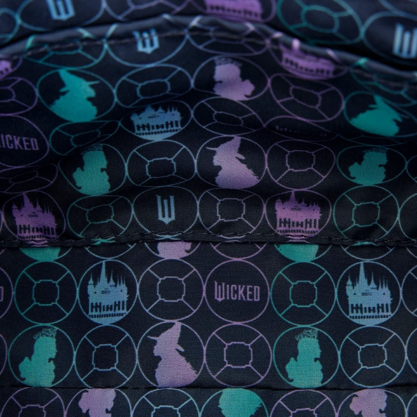 This crossbody bag features a debossed all-over print featuring various motifs that represent Glinda and Elphaba. For an extra cute touch, you'll find a pink chain handle and a green chain that drapes across the body of the bag. The green chain has pink and green charms attached, including a broomstick, butterfly, witch hat, and the Wicked "W”. Suitable for ages 8 and up.