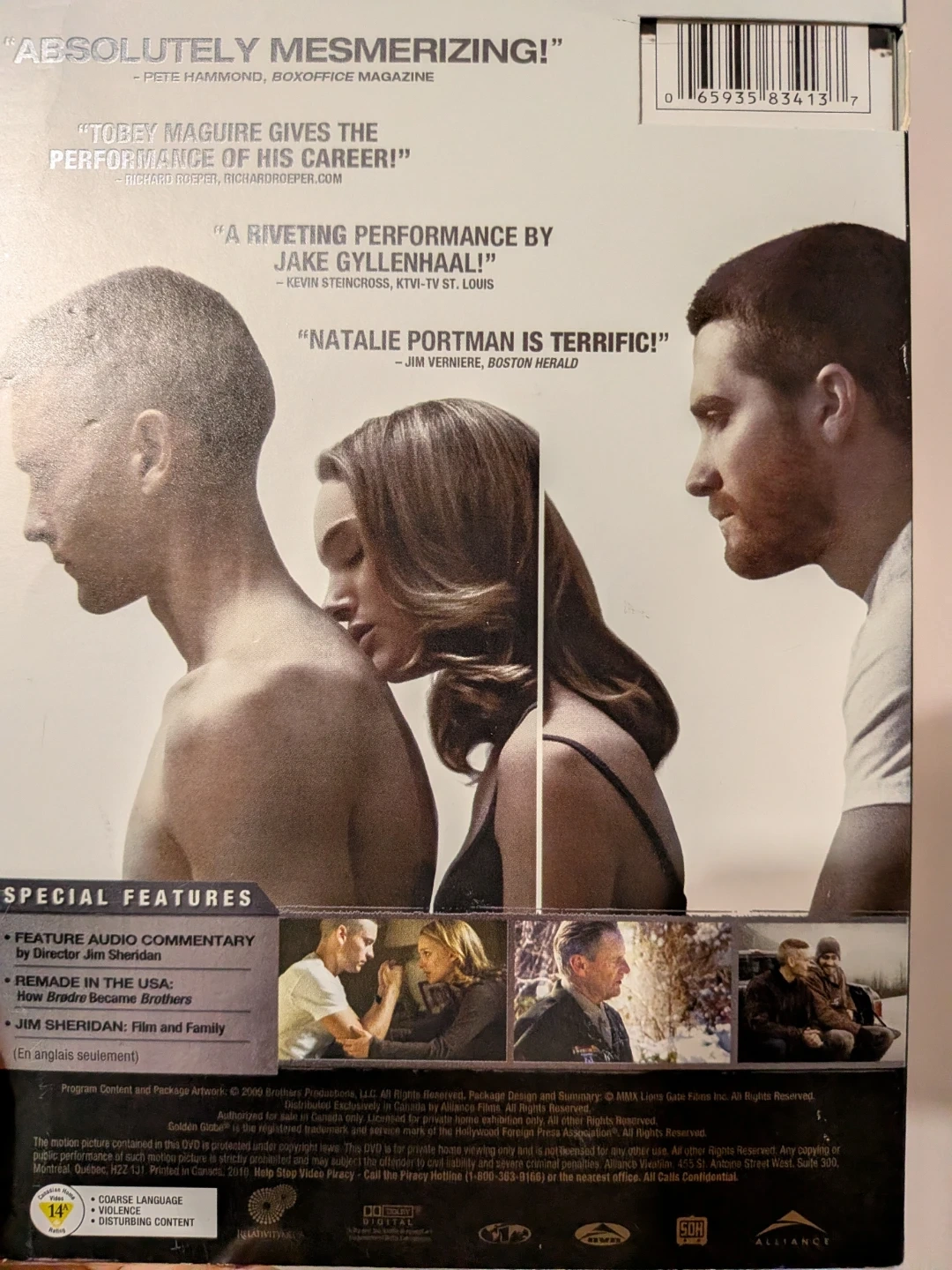 Selling the DVD movie Brothers starring Tobey Maguire, Jake Gyllenhaal, and Natalie Portman! This drama film is a riveting performance by Jake Gyllenhaal and has been described as "absolutely mesmerizing" by critics