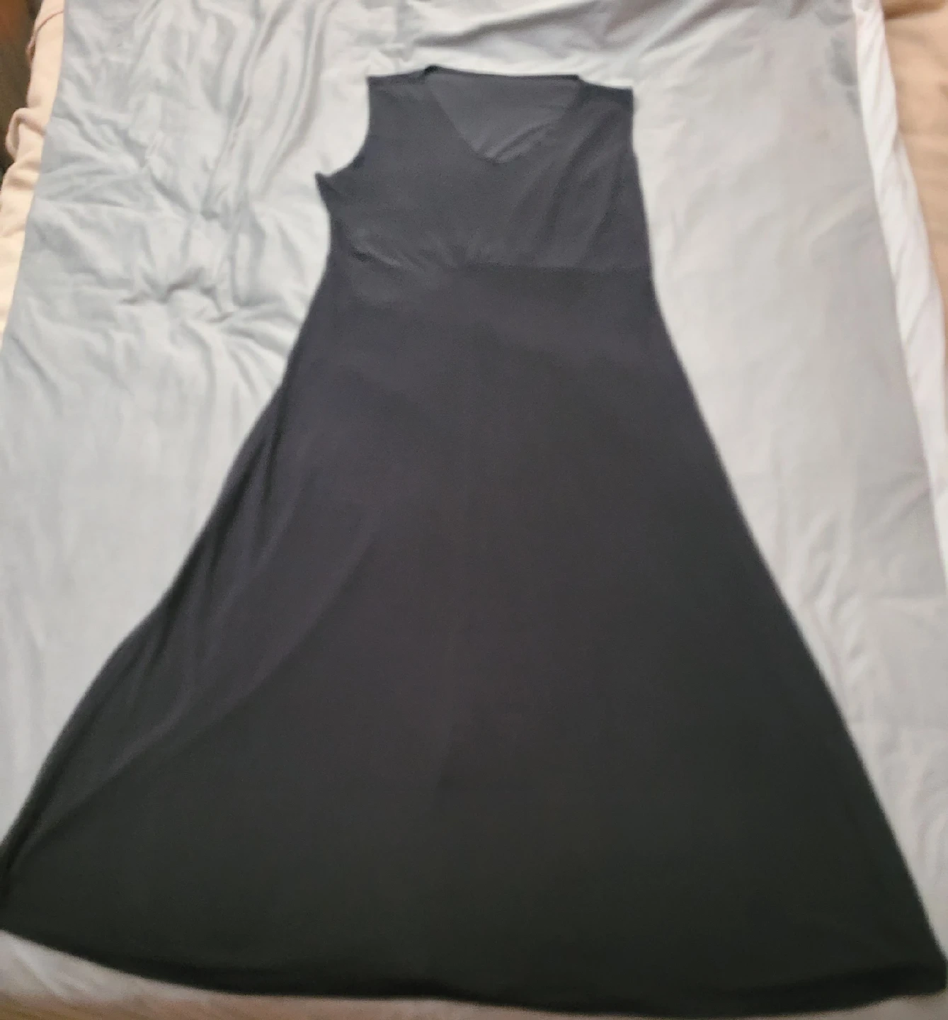 This is a stylish black dress, perfect for any occasion, offering a flattering fit with its V-neck design and comfortable fabric. The dress is in good condition.